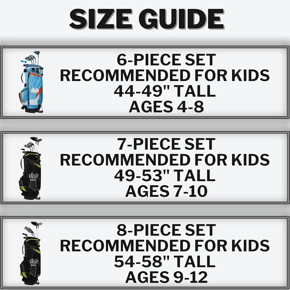 • 3 DIFFERENT SET OPTIONS: Our 6-piece set is made for kids aged 4–8 between 44-49" tall (Fairway wood, 3 irons, Blade Putter, Carry Bag). Our 7-piece set is made for kids aged 7–10 between 49 - 53" tall (Driver, Hybrid, 3 irons, Blade Putter, Carry Bag). Our 8-piece set is made for kids aged 9–12 between 54 - 58" tall (Driver, Fairway Wood, 4 irons, Blade Putter, Carry Bag).