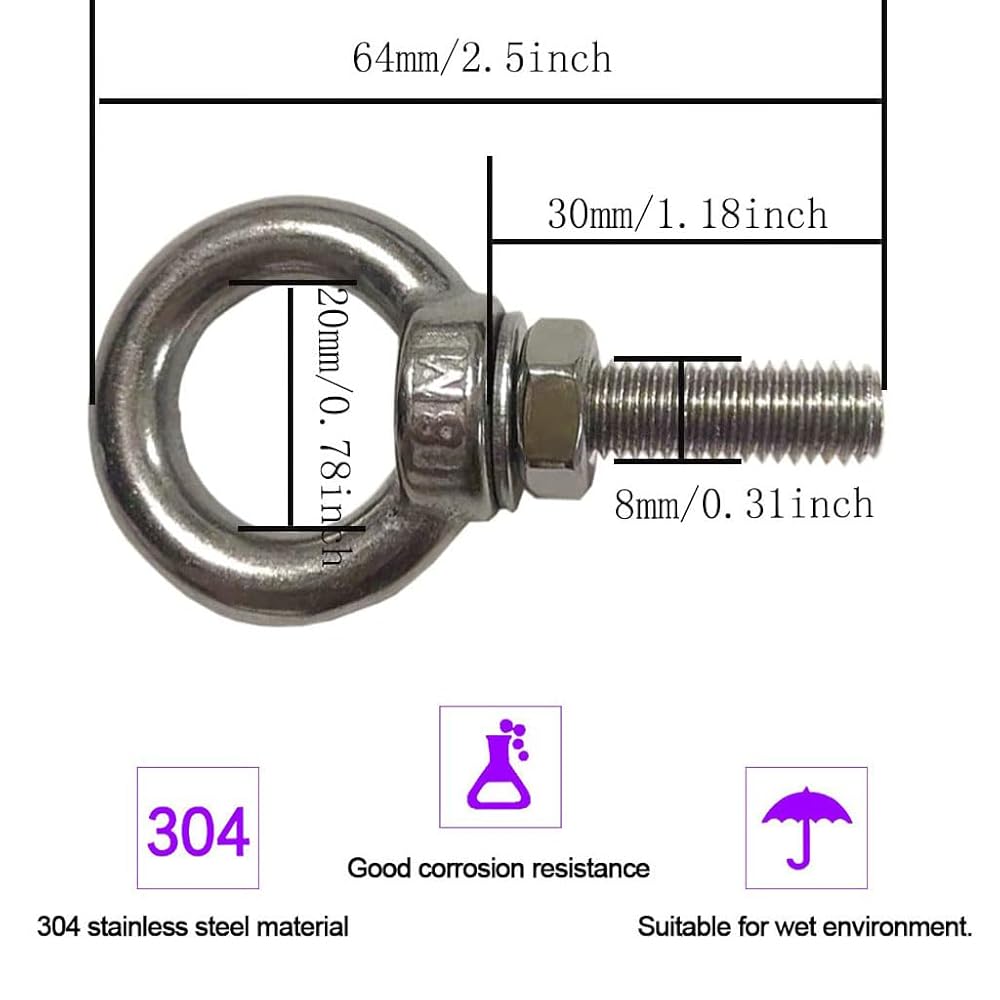【Dimension】: This M8 Eye Bolt rod total length 65mm/2.56inches, thread outer diameter is 8mm/0.31inch, thread length 30mm/1.2inches, ring inner diameter 20mm/0.78inch