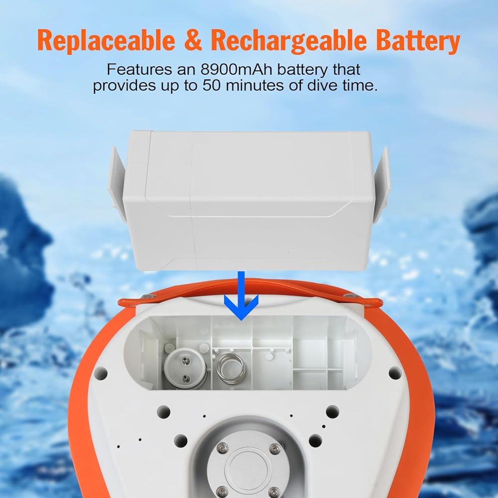بطارية قابلة للاستبدال وقابلة لإعادة الشحن: يتميز خزان الغوص هذا ببطارية قابلة لإعادة الشحن والاستبدال بقدرة 8900 مللي أمبير في الساعة، والتي يمكن إعادة شحنها لآلاف المرات، مما يضمن أداء وموثوقية طويلة الأمد لرحلات غوص متعددة. مثالية لكل من الغواصين المبتدئين وذوي الخبرة
