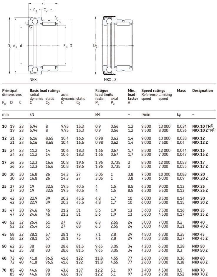 NKX .. Z series needle roller / thrust ball bearings are non-separable. They have a stamped steel cover that extends over the shaft washer of the thrust ball bearing. It is firmly attached to the housing washer that is integral to the needle roller bearing outer ring. The cover makes these bearings non-separable. Supplies the thrust ball bearing in this series filled, as standard, with a high-quality grease that has good rust inhibiting properties.