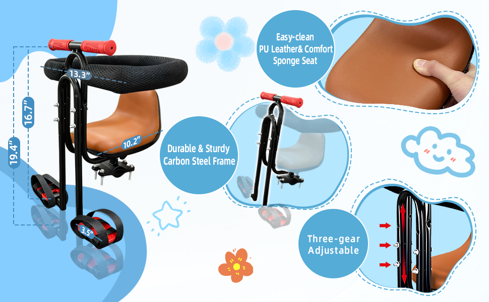 • هيكل آمن وقوي: مقعد دراجة الطفل مصنوع من الفولاذ عالي الكربون لدعم ما يصل إلى 55 رطلاً. تضمن البراغي الصلبة ذات الحشيات المطاطية تقليل الحركة مع حماية طلاء دراجتك من الخدوش. زاوية قابلة للتعديل تتكيف مع القضبان المتقاطعة المائلة، مما يضمن مقعدًا مستويًا ومريحًا