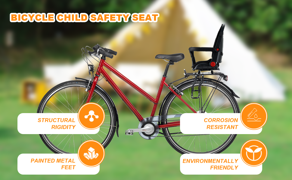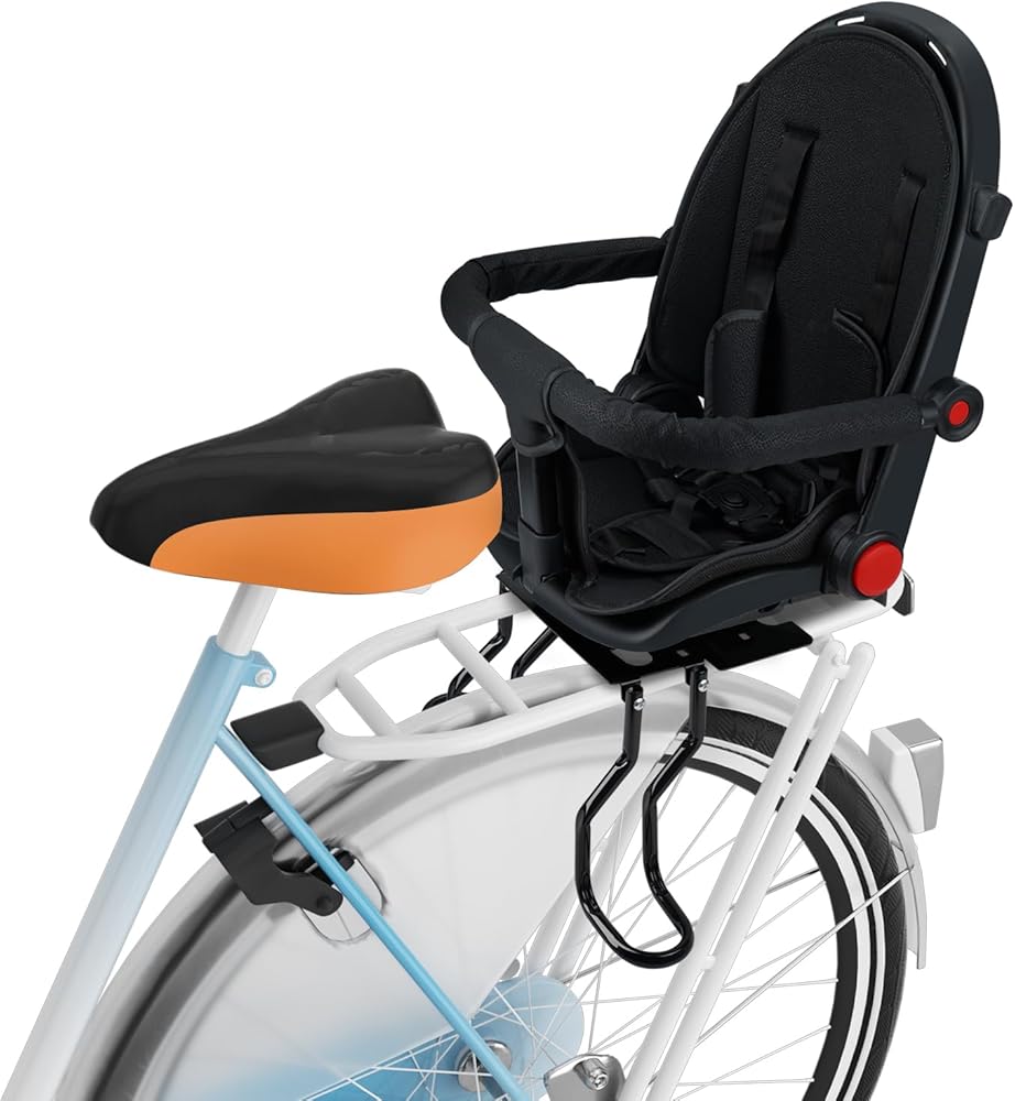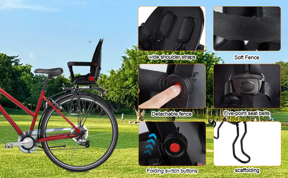 【حماية مزدوجة للراحة والأمان】 يوفر مقعد دراجة الأطفال المثبت في الخلف حماية مزدوجة للأطفال: مسند ظهر داعم عريض، ومساند ذراع إسفنجية ناعمة، ووسادة مبطنة تحافظ على راحة الأطفال، بينما يضمن حزام الأمان ذو الإبزيم ثلاثي النقاط السلامة. دواسات القدم السميكة تمنع الانزلاق، مما يسمح لك ولطفلك بالاستمتاع بمناظر ركوب الدراجات دون قلق