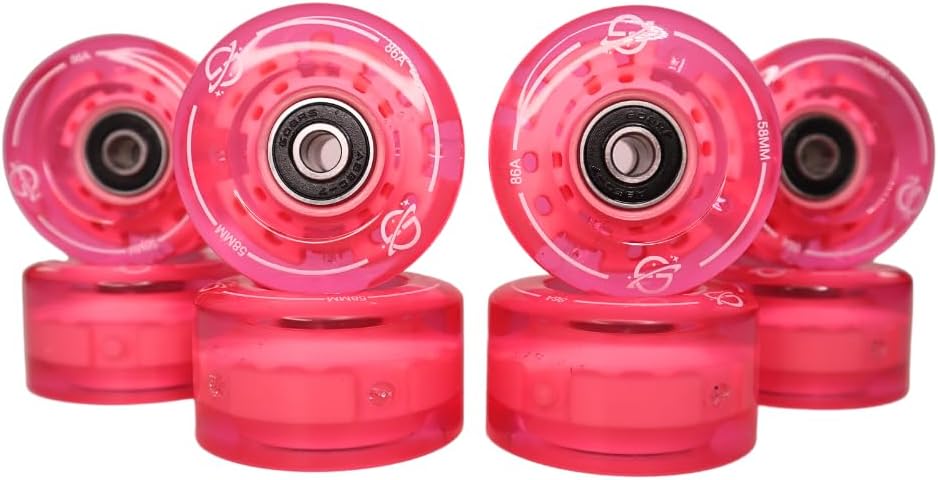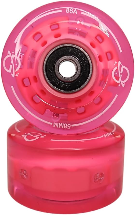 Light up your skate sessions with the Venus Rose LED Roller Skate Wheels from Galaxy Skates—designed to combine eye-catching style with top-tier performance. This set of 8 dual-color pink and soft gold LED wheels creates a radiant glow that activates with motion, meaning no batteries or charging are ever needed. Perfect for skating indoors at the rink, cruising on smooth pavement, or adding sparkle to nighttime adventures, these wheels are made from durable 86A urethane that offers a smooth, controlled ride with excellent grip on a variety of surfaces. Each wheel comes pre-loaded with high-precision black carbon steel bearings for a fast and reliable roll right out of the box. Whether you're upgrading your favorite Galaxy Skates or customizing a new pair, the Venus Rose LED Wheels add a graceful, shimmering touch that turns heads wherever you glide. Skate with confidence, shine bright, and enjoy every roll with style and performance combined.