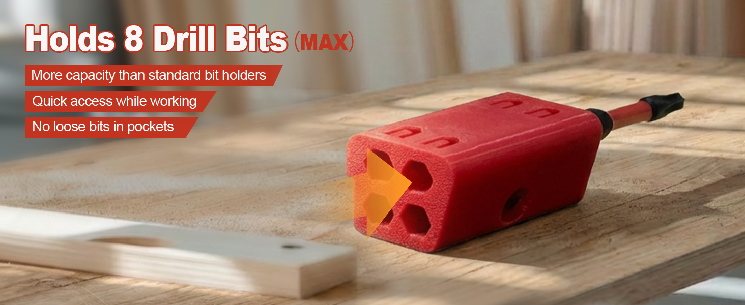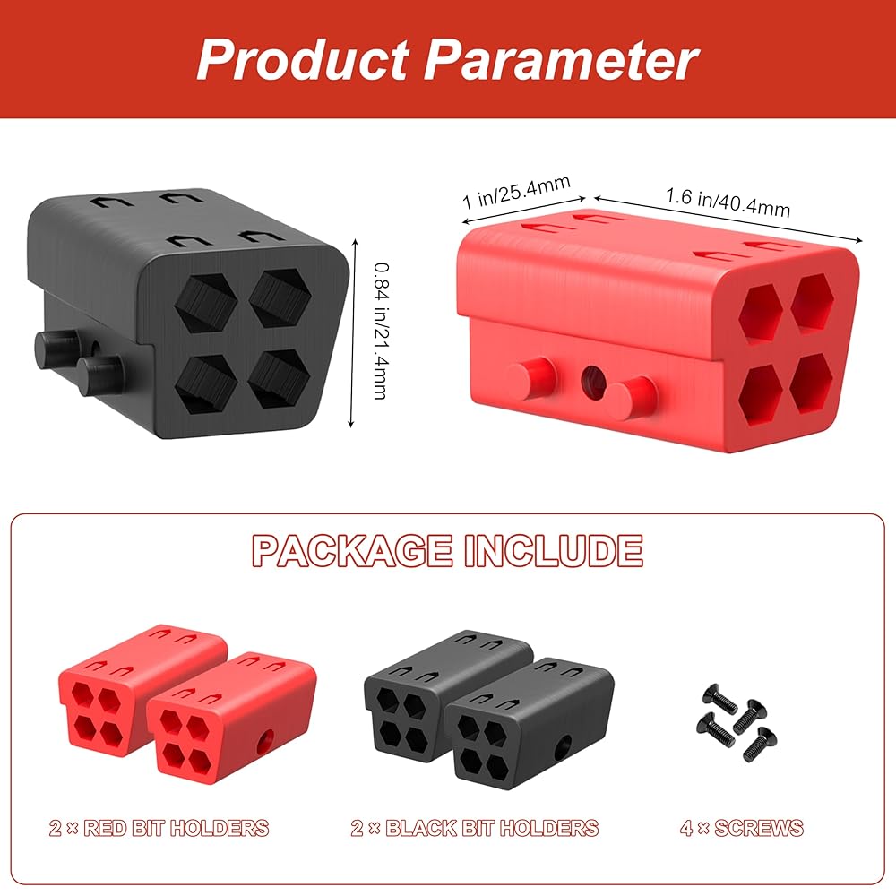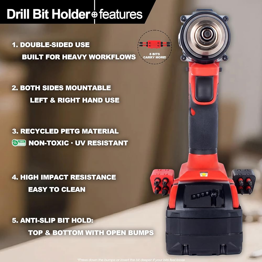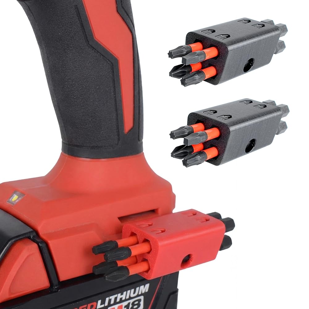حامل لقم الثقب ذو 4 فتحات يقوم كل حامل لقم الثقب بتخزين ما يصل إلى 4 إلى 8 لقم في وقت واحد، مما يوفر سعة أكبر من حاملات اللقم القياسية. احتفظ بالبتات الشائعة الاستخدام منظمة وجاهزة للمقايضة السريعة.