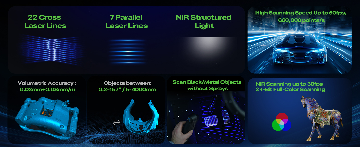 • مسح ضوئي بالليزر فائق السرعة وعالي الدقة: حقق دقة على مستوى علم القياس بسرعة مذهلة. يلتقط هذا الماسح الضوئي 660,000 نقطة في الثانية باستخدام مزيج فريد من 22 ليزر أزرق متقاطع لتغطية واسعة و7 ليزر أزرق متوازي يوفر دقة بالغة تبلغ 0.02 مم، ويتعامل بكفاءة مع التفاصيل المعقدة على الأشياء بدءًا من المكونات الصغيرة وحتى هياكل السيارات الكبيرة مع تقليل عمليات المسح المتكررة