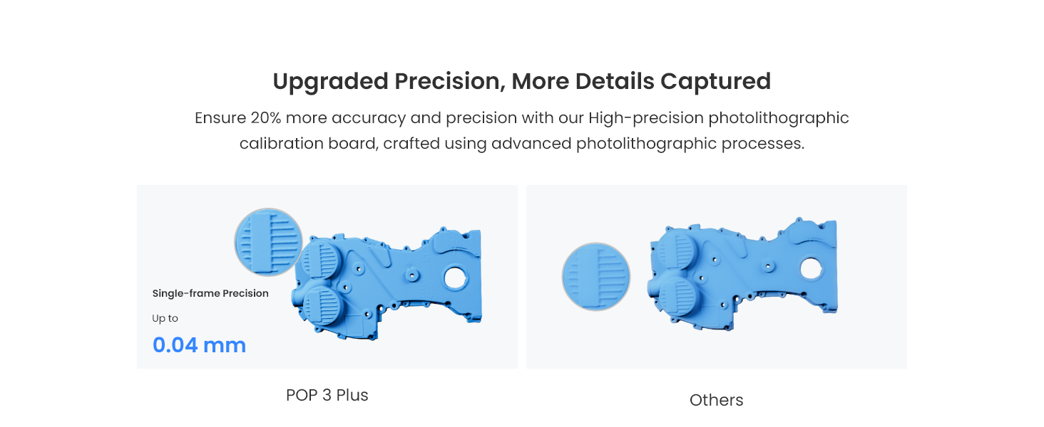 • الدقة المحسّنة: قم بإنشاء نماذج ثلاثية الأبعاد مفصلة بدقة وإحكام أكبر بنسبة 20%. تضمن لوحة المعايرة الجديدة، المصنوعة باستخدام عمليات الطباعة الحجرية الضوئية المتقدمة، بقاء جهاز POP 3 Plus في حدود 20 ميكرون من الدقة. التقط التفاصيل بدقة أكبر باستخدام وظيفة التكبير البصري الجديدة لجهاز العرض POP 3 Plus (تكبير 1.5x و2x) للحصول على تفاصيل سحابية أكثر بنسبة 30%