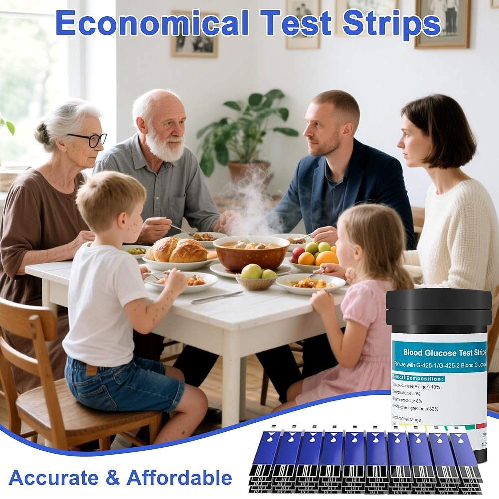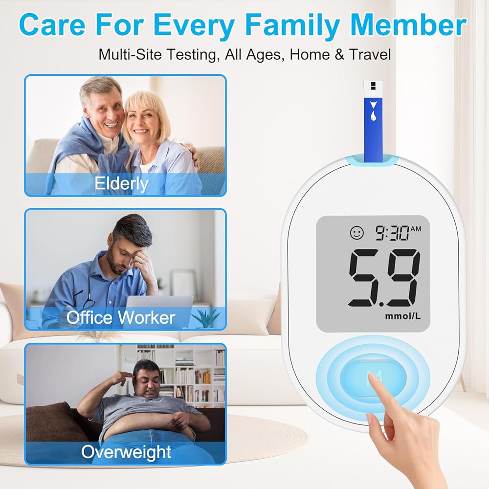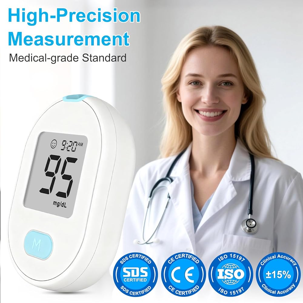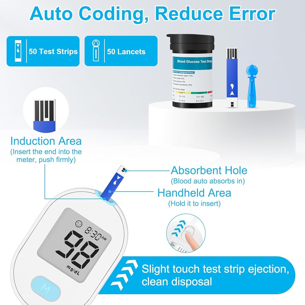 🩺 مجموعة مراقبة الجلوكوز الكل في واحد للاستخدام المنزلي: تتضمن مجموعة اختبار السكر الكاملة جهاز قياس نسبة السكر في الدم، و50 شريط اختبار، و50 مشرطًا، وجهاز وخز، وبطاريات، وحقيبة سفر - كل ما يلزم لإجراء اختبار دقيق لسكر الدم في المنزل دون أي مشتريات إضافية.