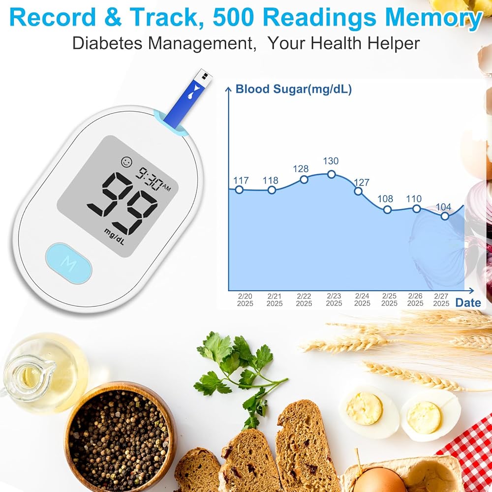 📊 500 اختبار لذاكرة الاختبار وتتبع الاتجاه: يقوم جهاز قياس نسبة السكر في الدم هذا بتخزين ما يصل إلى 500 قراءة ويحسب متوسطات 14 يومًا للمساعدة في تتبع اتجاهات الجلوكوز لديك. من السهل مشاركتها مع مقدم الرعاية الصحية الخاص بك للحصول على رعاية أفضل لمرض السكري.