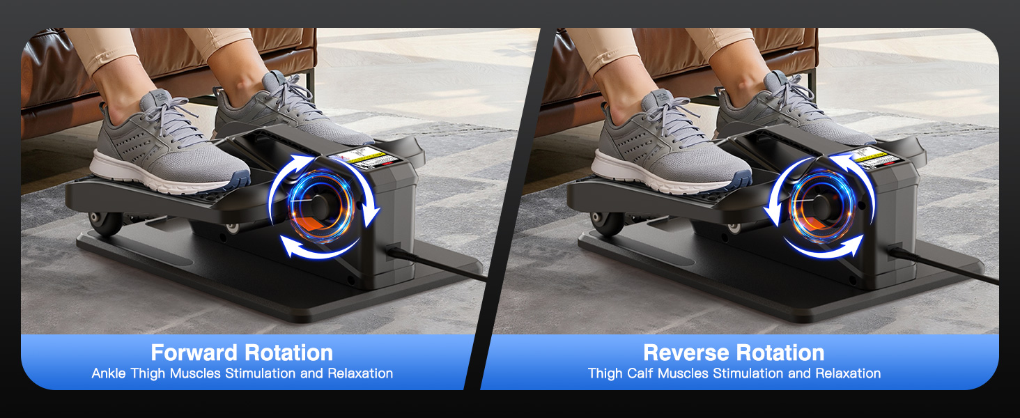 • Adjustable Resistance & Speed: The elliptical exercise machine utilizes the latest motor system and is available in manual mode speeds (HR-1 ~ HR-12) and automatic mode speeds (P1 ~ P3). When the elliptical is in manual mode. press "DIRECTION” in the remote control to switch the direction of movement for different muscle groups and ligament exercises. Forward Rotation Stimulates and relaxes the ankle and thigh muscles. while reverse rotation stimulates and relaxes the thigh and calf muscles.