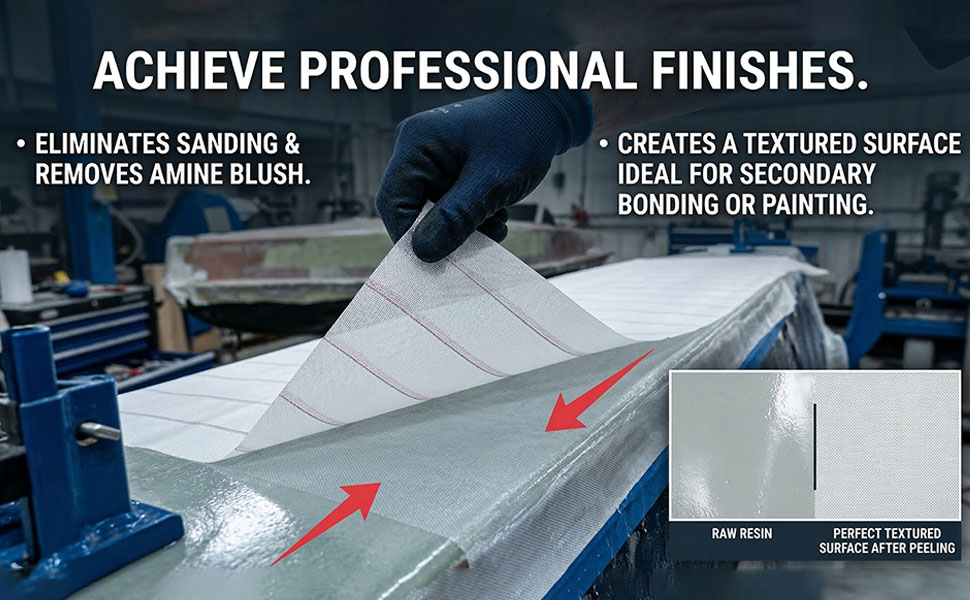 تحقيق اللمسات النهائية الاحترافية: يخلق هذا النسيج القابل للتقشير سطحًا مزخرفًا مثاليًا للربط الثانوي أو الطلاء؛ إنه يلغي الحاجة إلى الصنفرة الشاقة عن طريق كسر سطح الراتنج عند إزالته، مما يوفر الوقت والجهد في التصنيع المركب
