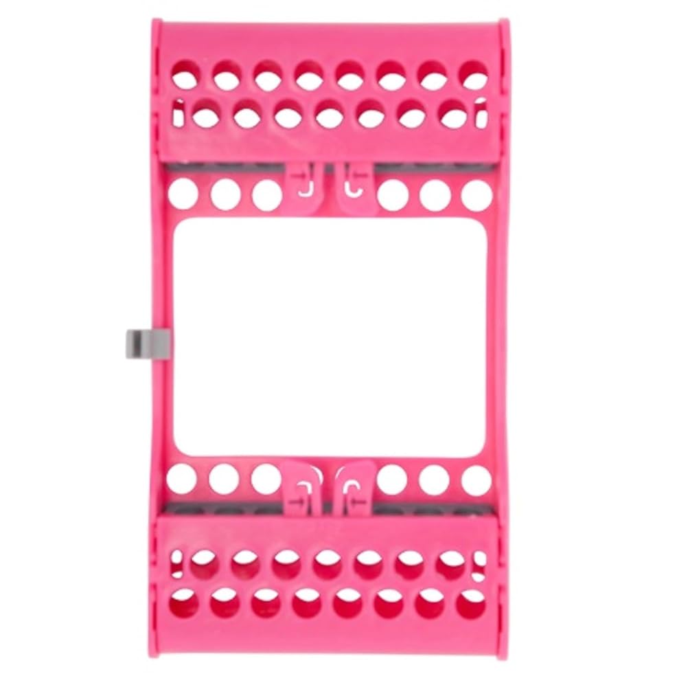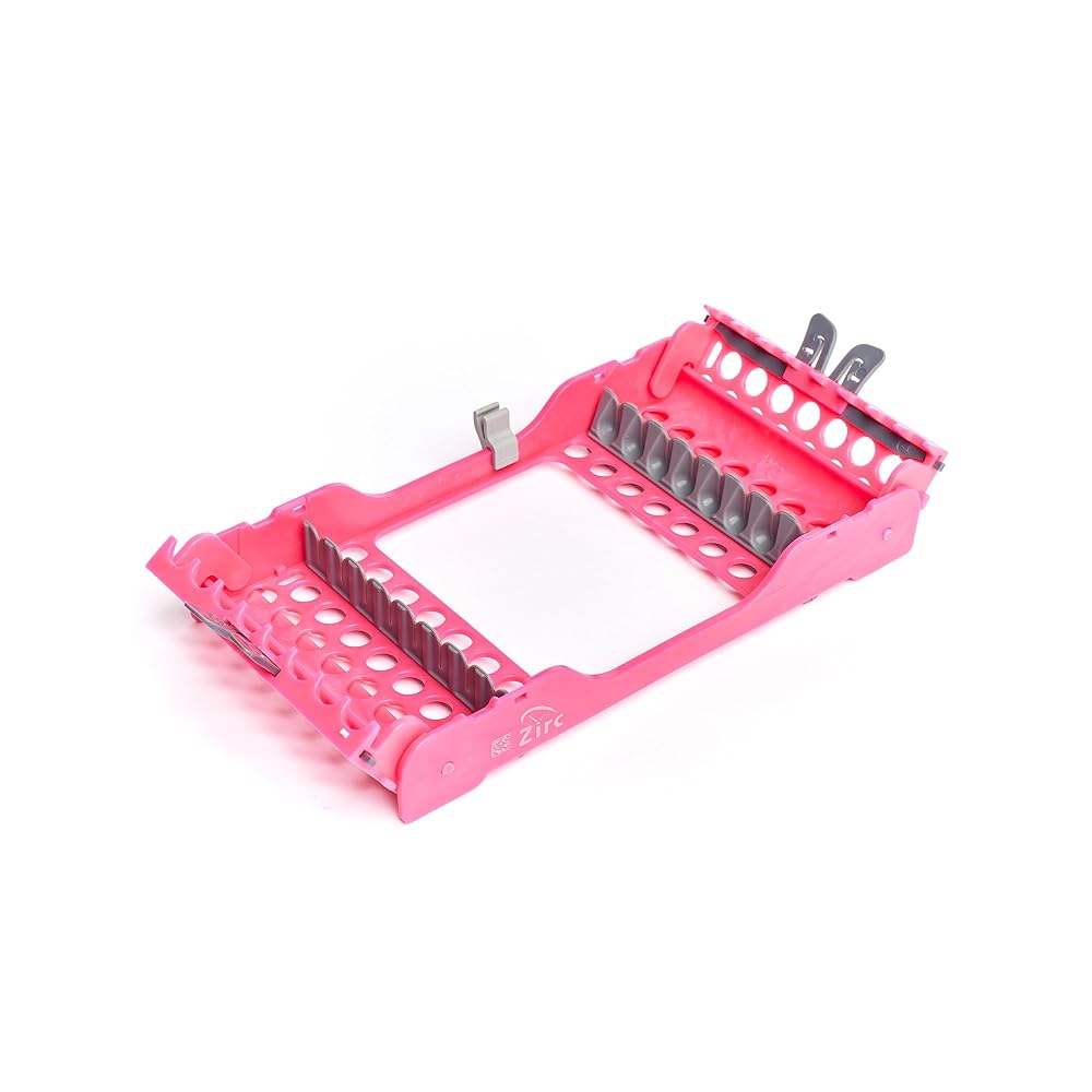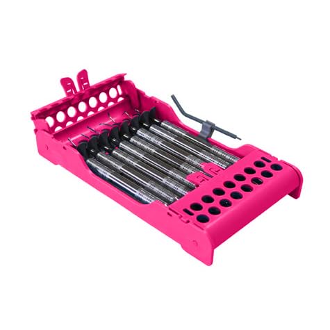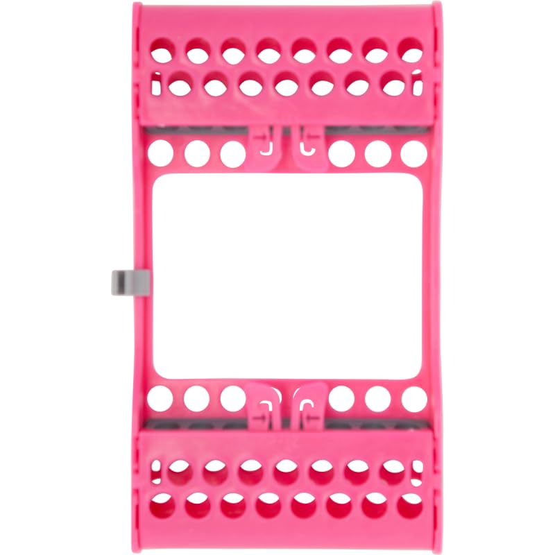 E-Z Jett Cassette 8 Instrument Holder, Neon Pink, open top, round holes and radiused corners, attached cover folds back easily, dimensions: 7-15/16" x 4-7/16" x 1-1/8", autoclavable up to 136C/275F, single cassette.