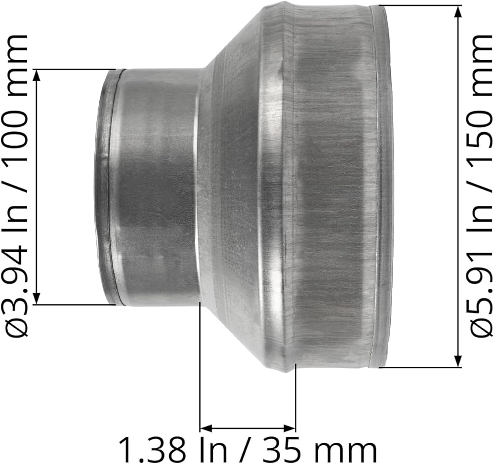 This round ducting adapter is designed to seamlessly connect 150mm (6") ducting to 100mm (4") systems, making it easy to adapt between different ventilation sizes in one simple step. Featuring a 150mm male to 100mm male configuration, it provides a secure, efficient transition for a wide range of air-movement applications. Manufactured from durable galvanized steel, this reducer offers excellent resistance to corrosion, heat, and everyday wear — ensuring long-lasting performance in both residential and commercial environments. Its rigid construction supports stable airflow while maintaining structural integrity, even in demanding setups. Ideal for HVAC systems, bathroom extractors, kitchen range hoods, tumble dryers, inline fans, hydroponic grow rooms, and general ventilation projects, this versatile connector works with both solid and flexible ducts. Whether you're upgrading an existing system or installing new equipment, it enables fast, reliable connections between mismatched duct sizes. Suitable for DIY users and professional installers alike, this duct reducer provides a practical, all-in-one solution for adapting airflow systems across kitchens, bathrooms, offices, workshops, and commercial spaces — delivering dependable ventilation wherever it's needed.