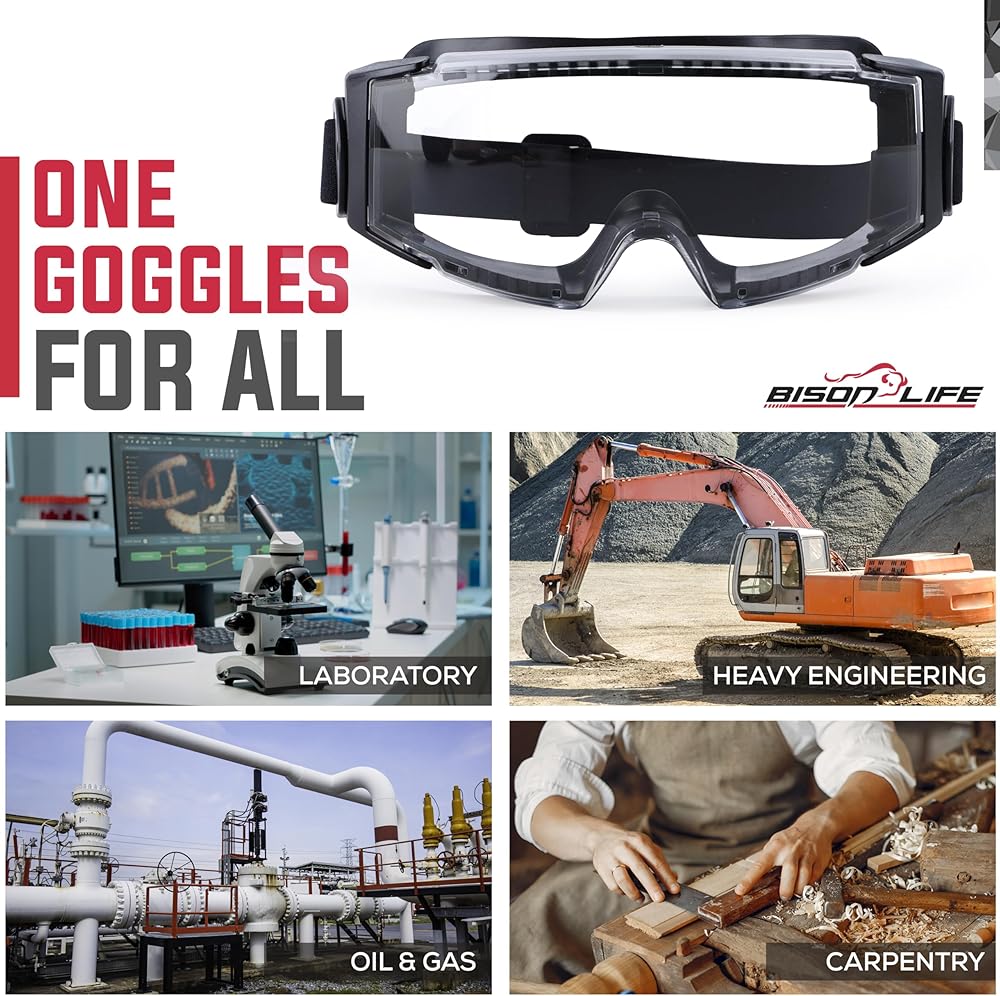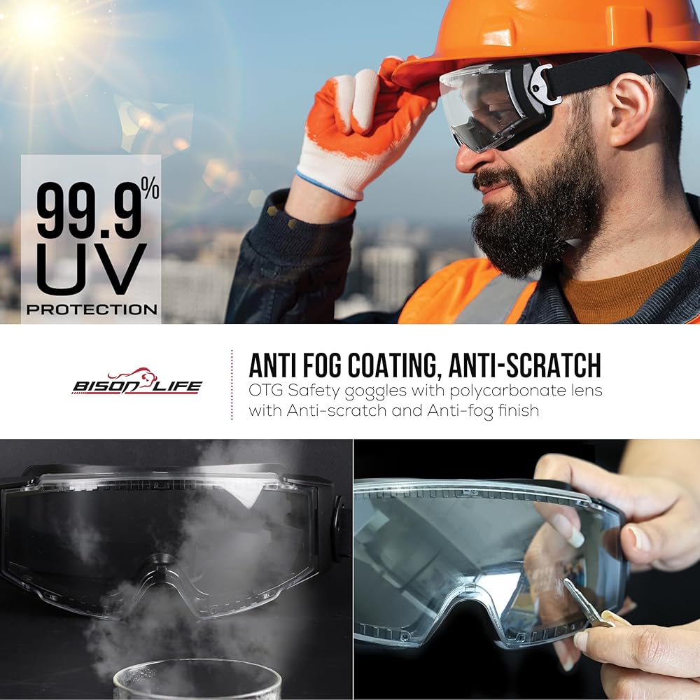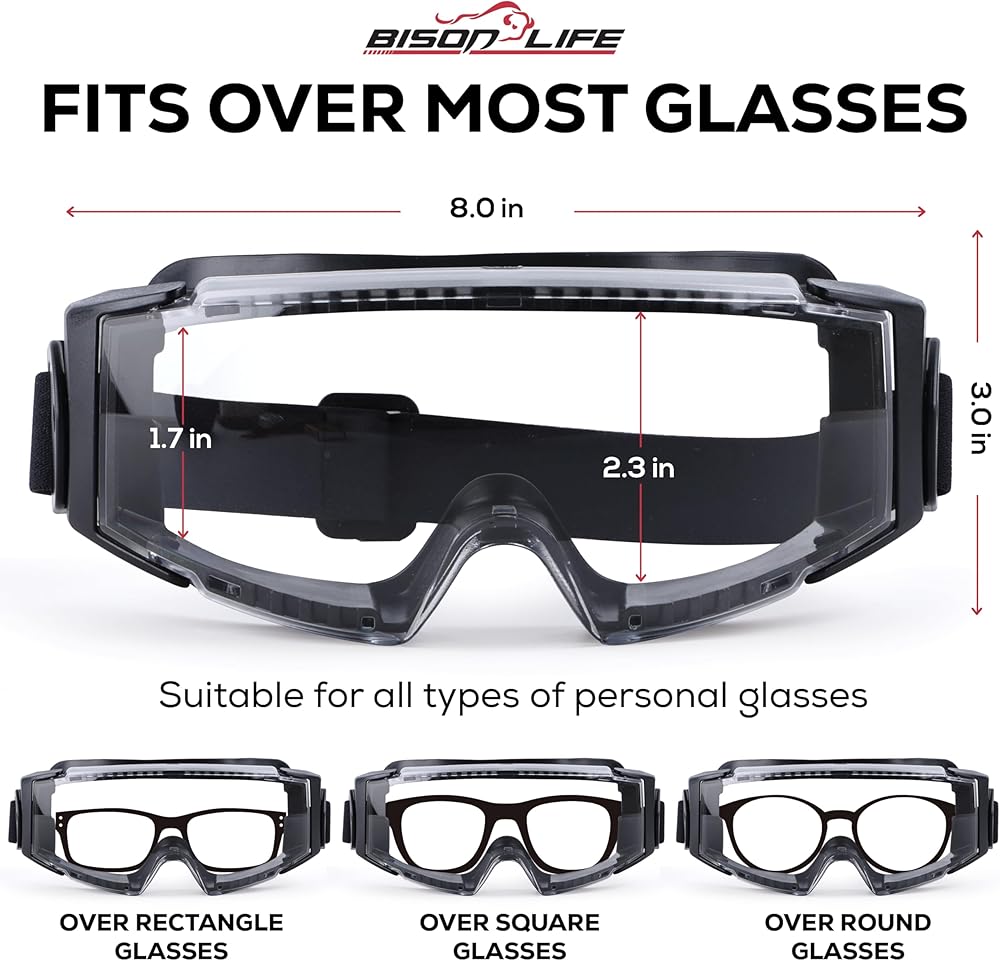BISON LIFE SplashPro، نظارات أمان فوق النظارات، نظارات أمان مضادة للضباب ANSI Z87.1، مقاومة للصدمات والخدش، حماية العين فوق النظارات الطبية، حزام قابل للتعديل، نظارات المختبر والعمل