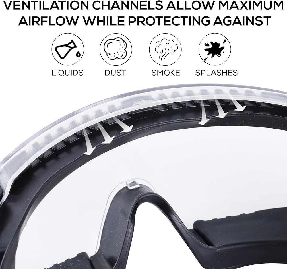 • نظارات العمل والمختبر: مناسبة للبناء، ومختبرات الكيمياء، والأعمال الخشبية، والطلاء بالرش، وغسل الضغط، وقص العشب، وحماية العين في المتجر العام أو موقع العمل.