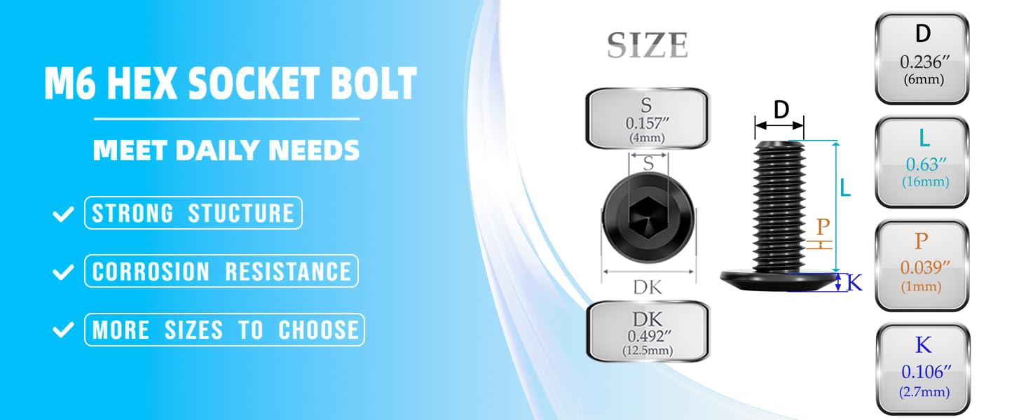مقاس المسمار M6: طول المسمار 16 مم، قطر الخيط 6 مم، مسافة الخيط 1 مم، ارتفاع الرأس 2.8 مم، حجم المحرك السداسي 4 مم، مثالي للأثاث، وتجميع أرفف البضائع والاستخدام الخارجي