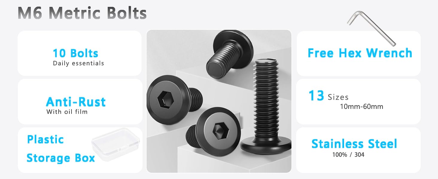 تعبئة البراغي مقاس M6 × 16 مم: 10 قطع في كل مجموعة مع مفتاح ربط سداسي واحد، تأتي مع حاوية تخزين شفافة متينة وقابلة لإعادة الاستخدام