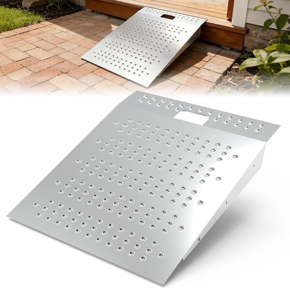 أقصى قدر من الأمان: يتميز منحدر السقيفة الخاص بنا بسطح لوح مثقوب يمنع الانزلاق في الظروف الرطبة. يوفر هذا المنحدر لمدخل السقيفة قوة جر قوية للإطارات والأقدام، مما يضمن المرور الآمن.
