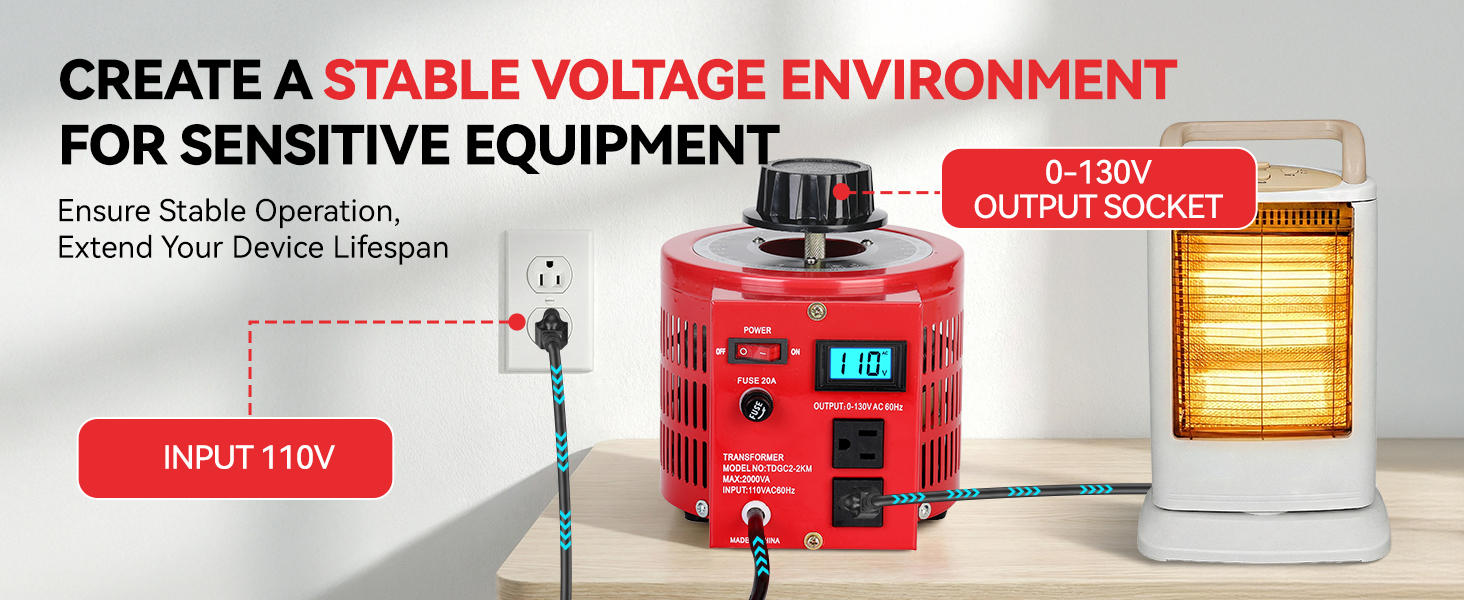 0-130 فولت الناتج الجهد قابل للتعديل: يمكن تعديل الجهد الناتج لهذا المحول المتغير من 0 إلى 130 فولت تيار متردد. تتميز بشاشة LCD، أكثر وضوحًا وبديهية ودقة. تم تصميم المحول المتغير بدقة عالية وصغير الحجم لسهولة النقل. يمكن لإمداد الطاقة بمنظم الجهد الكهربائي التلقائي أن يلبي الطلب على الطاقة لمعظم المعدات.
