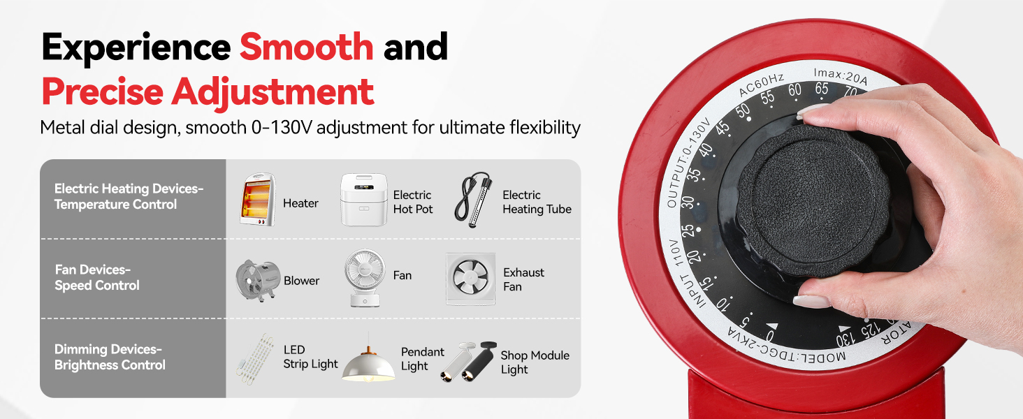 المرونة في التحكم في الجهد: يمكنك ضبط جهد الخرج بسهولة للتحكم السلس في السطوع ودرجة الحرارة والسرعة والمزيد - في متناول يدك مباشرةً. سواء كان في المنزل أو المكتب أو البيئة الصناعية، فإن منظمنا يوفر تحكمًا دقيقًا لتلبية الاحتياجات المتنوعة، مما يضمن تجربة أكثر راحة وكفاءة.