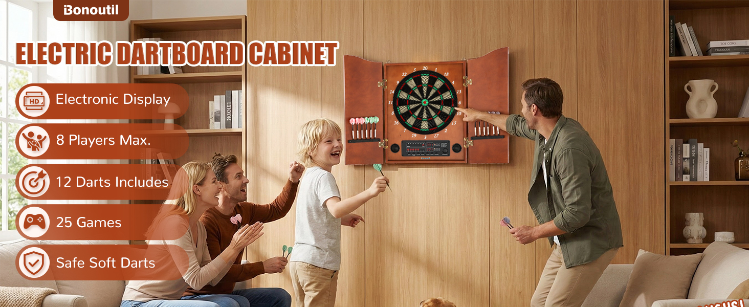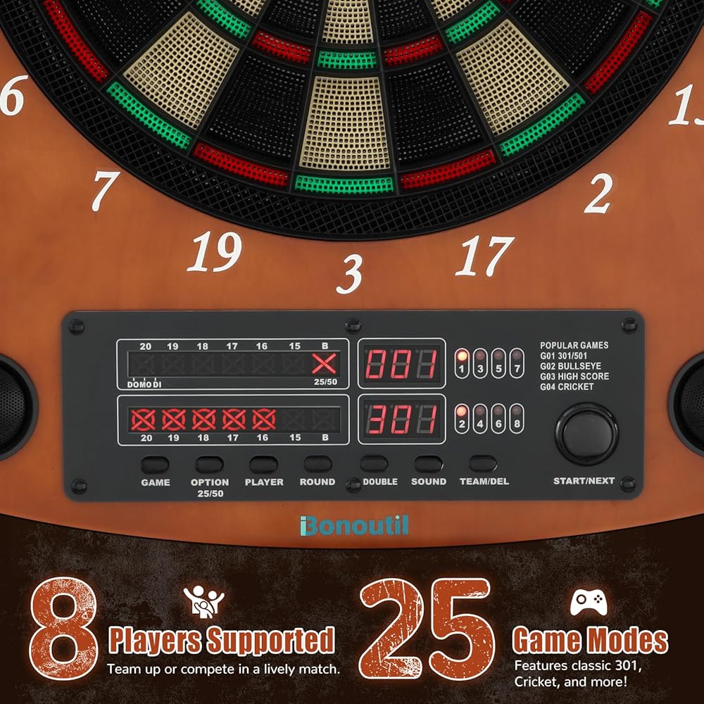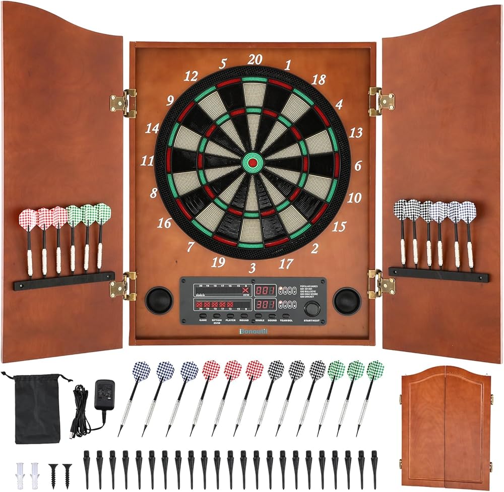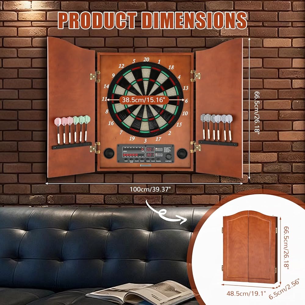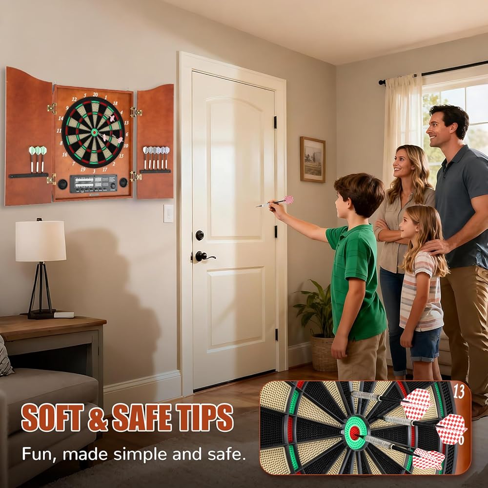 مجموعة خزانة رمي السهام الإلكترونية للبالغين من ألواح رمي السهام ذات الأطراف الناعمة مع خزانة، حتى 8 لاعبين، 25 لعبة مع 12 مجموعة من ألواح رمي السهام ذات الأطراف الناعمة للعب المنزلي العائلي