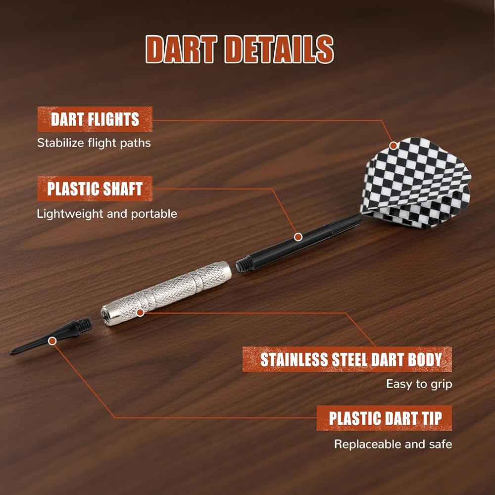 • سهام ذات أطراف ناعمة آمنة: مجهزة بـ 12 سهمًا ذات أطراف ناعمة، أطراف رمي السهام ناعمة ومرنة، وآمنة لجميع الأعمار للعب؛ يتم تضمين أطراف ناعمة إضافية قابلة للاستبدال (50+)، مما يسمح باستبدالها بسهولة بعد الارتداء. كما يحمي تصميم الطرف الناعم الثقوب الموجودة على سطح لوحة رمي السهام، مما يطيل عمر خدمة لوحة رمي السهام.