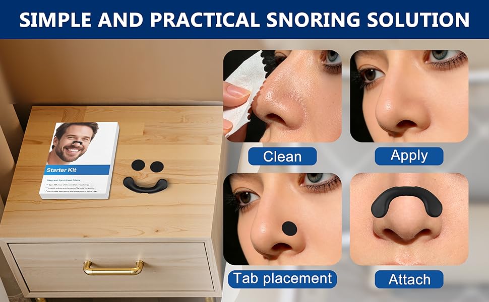• [شرائط أنف سهلة الاستخدام]: تحتوي العبوة على 4 شرائط أنف بأحجام مختلفة و30 وسادة لاصقة. اتبع دليل التعليمات لوضع الضمادات اللاصقة في المواضع الصحيحة، ثم حدد شريط الأنف الذي يناسب حجم أنفك وقم بتثبيت الشريط برفق على الوسادات. يمكنك بعد ذلك الاستمتاع بتدفق الهواء السلس وفوائد مكافحة الشخير