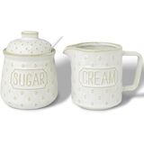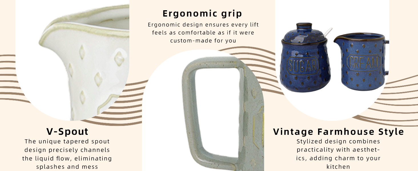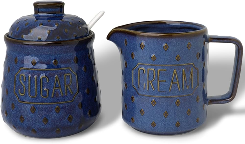 - نسيج منقوش أنيق: وعاء سكر وكريمة مصنوعان بشكل جميل من السيراميك مع تفاصيل منقوشة معقدة، مما يضيف لمسة من الرقي إلى مطبخك أو محطة القهوة الخاصة بك