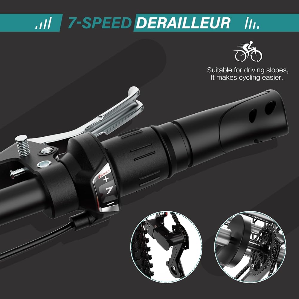 【مجموعة نقل الحركة بـ 7 سرعات مع فرامل قرصية أمامية سريعة الاستجابة】يضمن نظام التروس ذو 7 سرعات ركوبًا سلسًا عبر الطرق المسطحة والانحدارات اللطيفة، بينما توفر فرامل القرص الأمامية قوة إيقاف سريعة الاستجابة للتحكم اليومي الآمن والواثق.