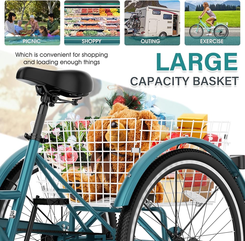 【سعة 350 رطلاً مع سلة خلفية واسعة】تم تصميم هذه الدراجة ثلاثية العجلات للبالغين من أجل المتانة والعملية، وتدعم ما يصل إلى 350 رطلاً وتتضمن سلة خلفية كبيرة للبقالة أو الحقائب أو مستلزمات النزهة أو الأغراض الشخصية - مثالية للتنقل والمهام والرحلات الترفيهية.
