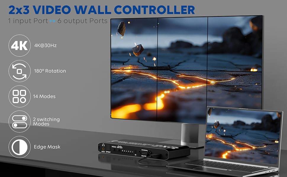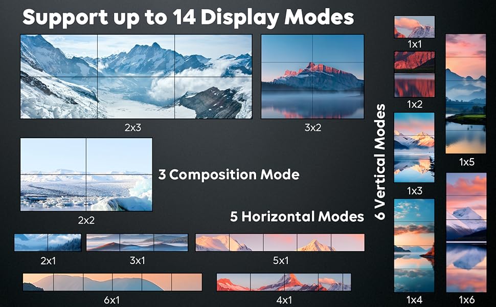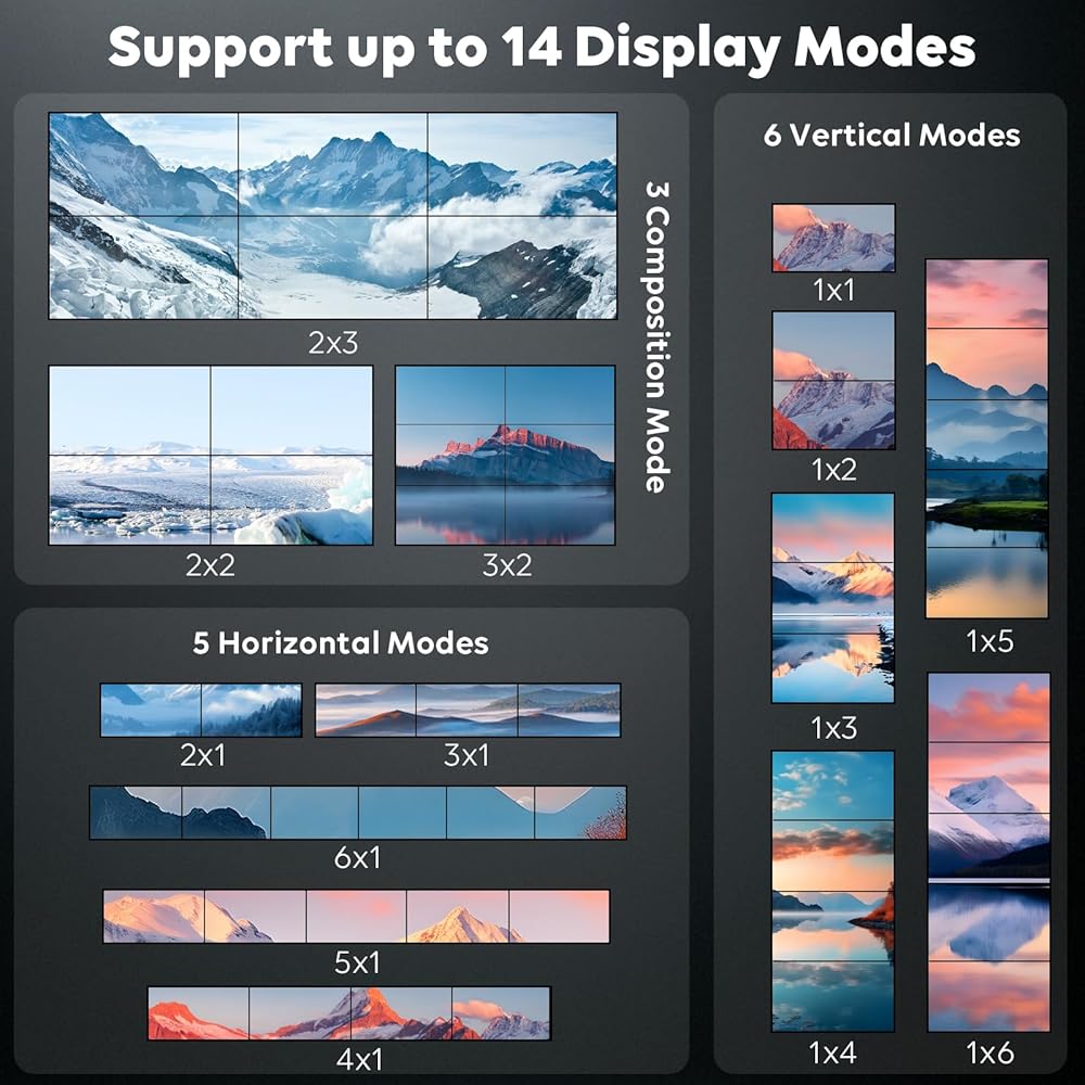 ☆【 14 وضع توصيل】يمكن لمعالج صور الفيديو HDMI 2x3 توصيل ما يصل إلى 6 أجهزة تلفزيون LCD أو شاشات أخرى ويدعم أوضاع العرض المتعددة، مثل 2x3، 2x2، 3x2 1x1، 1x2، 1x3، 1x4، 1x5، 1x6، 2x1، 3x1، 4x1، 5x1، 6x1. الخيارات التي يمكن تبديلها بسهولة من خلال جهاز التحكم عن بعد بالأشعة تحت الحمراء دون الحاجة إلى الاستيقاظ. أو اضغط على زر "التبديل" الموجود على وحدة التحكم الجدارية الخاصة بالتلفزيون. كما أنه يدعم جهاز التحكم عن بعد المتقدم RS232.