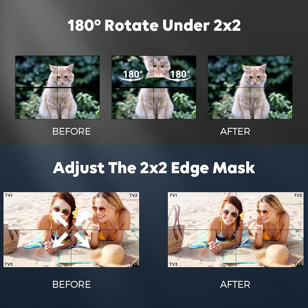 ☆【دوران الشاشة 180 درجة】يدعم وظيفة دوران الشاشة 180 درجة، يمكنك قلب صورة مخرج HDMI 1 والإخراج 2 إلى 180 درجة، مما يسمح لك بتثبيت شاشات العرض في اتجاه يحتوي على أنحف الحواف. تساعدك وظيفة إخفاء الحواف على إنشاء جدار فيديو كبير سلس. (يرجى ملاحظة أن التدوير يعمل فقط في وضع 2×2 ويجب ألا تزيد أجهزة الإدخال والإخراج عن 1080P@60HZ)
