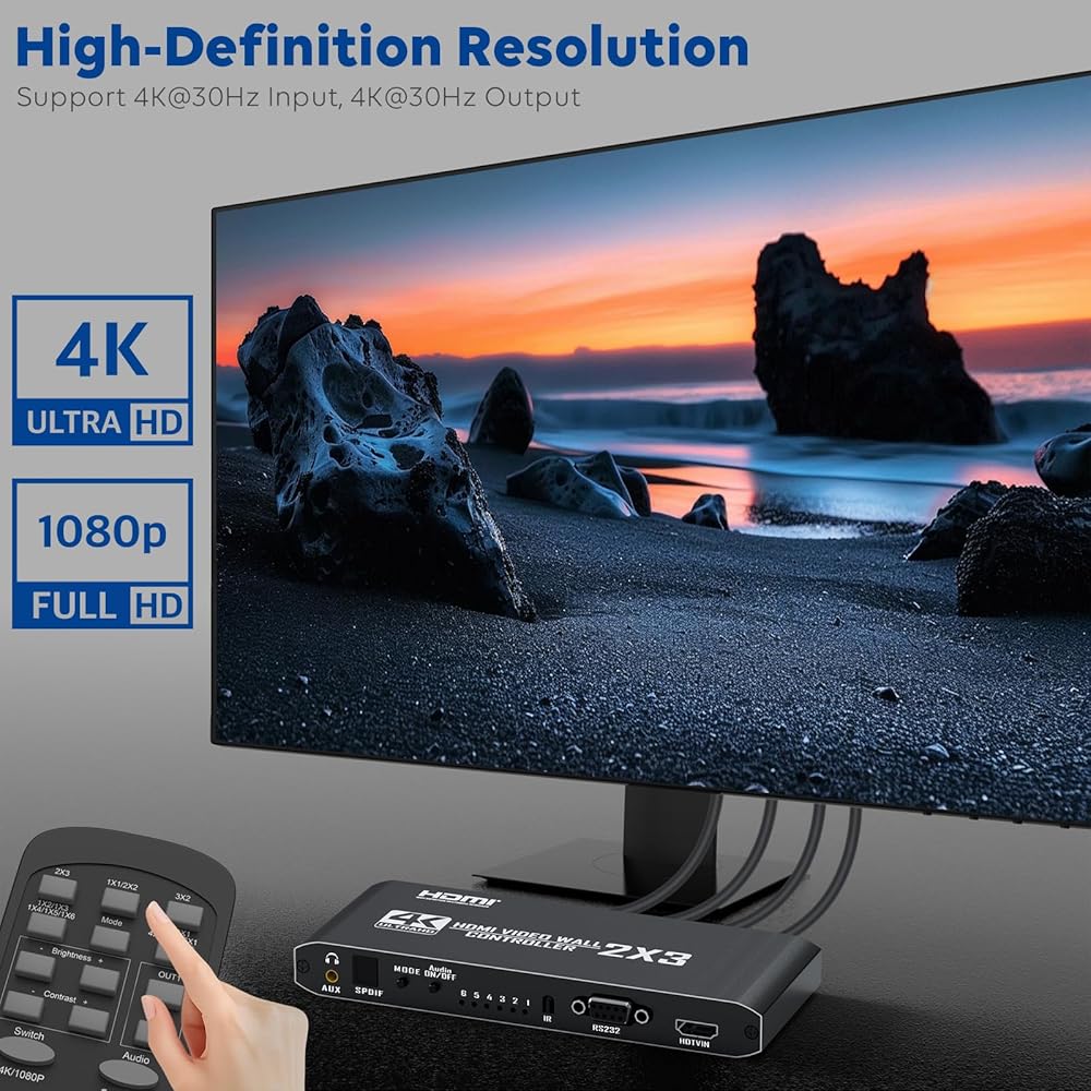 ☆ 【دقة 4K@30 هرتز UHD 】يمكن لمدخل HDMI وحدة تحكم جدار الفيديو HDMI 2x3 أن يدعم الدقة التي تصل إلى 4K@30 هرتز، بما في ذلك 3840x2160P @24/ 30 هرتز، 1920x1080P @25/ 30/ 50/ 60 هرتز؛ يمكن أن تدعم دقة إخراج HDMI 4K عند 30 هرتز. توافق الإدخال HDCP 1.4 وHDMI 1.4. كما أنه يدعم استخراج الصوت Toslink (5.1 CH) و3.5 ملم (2.0 CH).