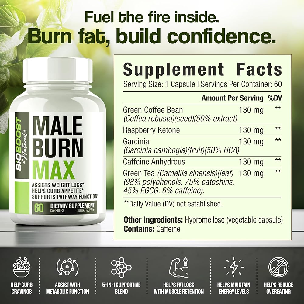 Male Burn MAX - حارق الدهون للرجال - حبوب إنقاص الوزن، دعم GLP-1، مثبط الشهية - 5 مكونات قوية للمساعدة في حرق الدهون مع الحفاظ على العضلات - تم اختبارها من قبل طرف ثالث - 60 كبسولة