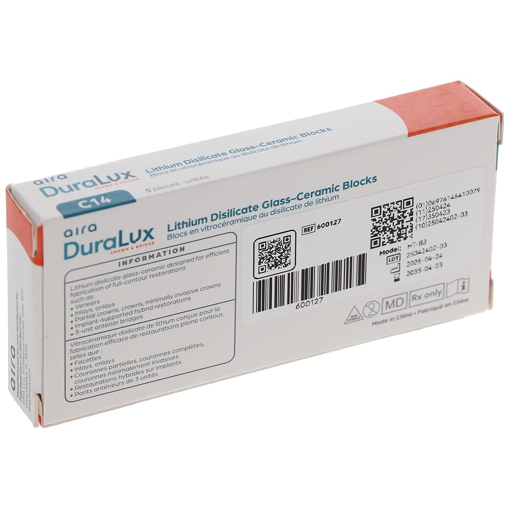 Aira 600127 DuraLux IPS e.max Type CAD /inLab HT B3 C14 5/Pk Equiv Ivoclar 626414. The Aira IPS e.max Type CAD blocks are composed of reliable lithium disilicate glass-ceramic, well-known for providing an exceptional balance between high flexural strength and natural, tooth-like esthetics. This particular block configuration is carefully engineered to achieve the optimal combination of opacity and natural appearance required for full-contour restorations like crowns and veneers.