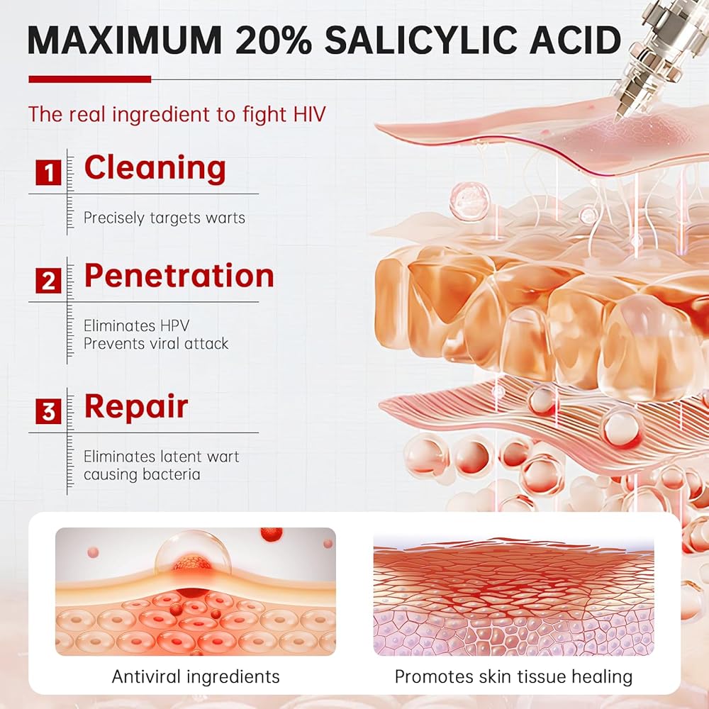 ✅تركيبة ذات قوة قصوى: يحتوي سائل إزالة الثآليل الخاص بنا على 20% من حمض الساليسيليك، وهو أعلى تركيز آمن، مشتق بشكل طبيعي بدون إضافات كيميائية قاسية للحصول على نتائج فعالة ولطيفة.
