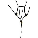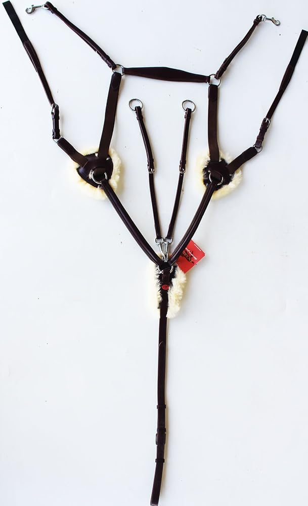 Beautiful english riding 5-point breast plate comes fully padded for comfort. Double stitched for durability, and features rust free stainless steel hardware. Available in Horse, Cob, and Pony size. Available in Black, and Brown.