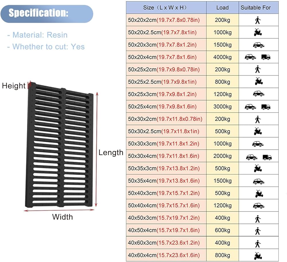 Crafted from durable resin materials, our trench drains are available in a sleek black finish. You can choose from various sizes, including lengths of 40cm and 50cm and widths ranging from 20cm to 60cm, with multiple height options. This flexibility allows you to customize your drainage solution to meet specific needs and fit any area seamlessly.