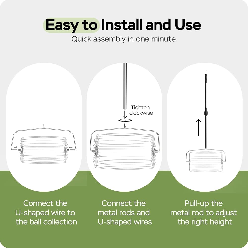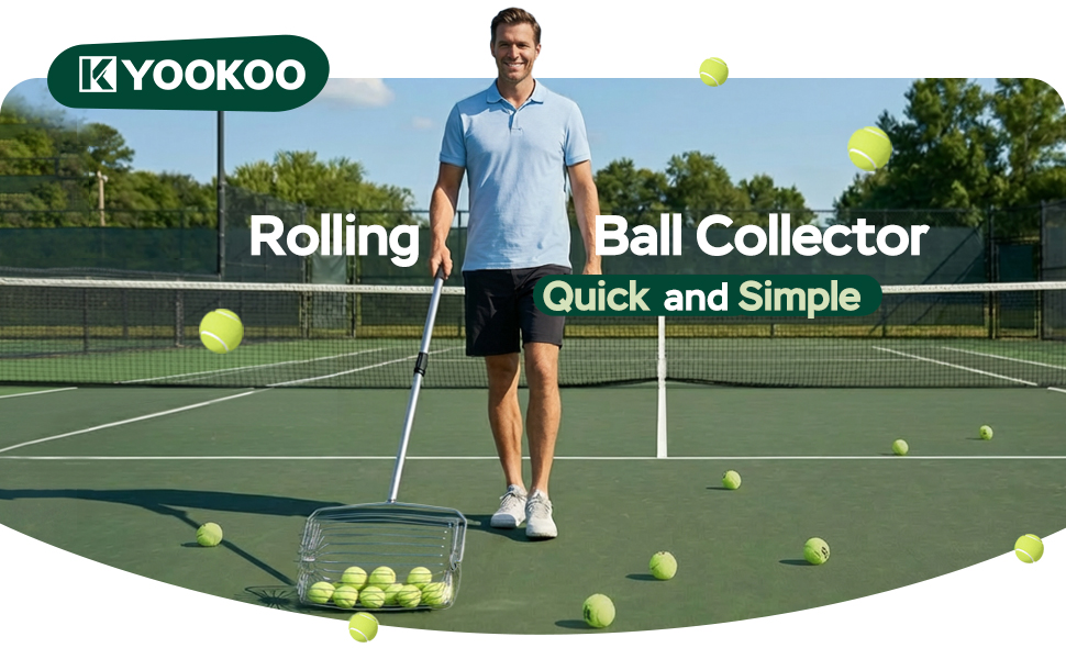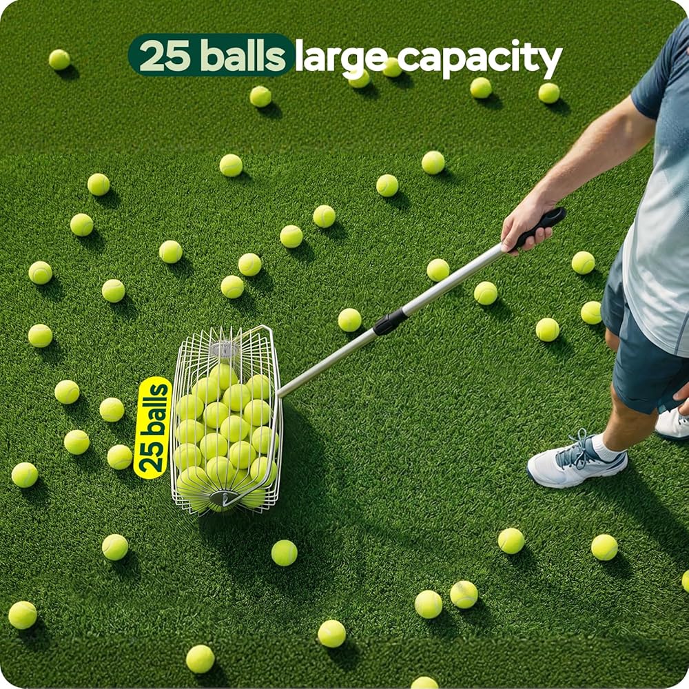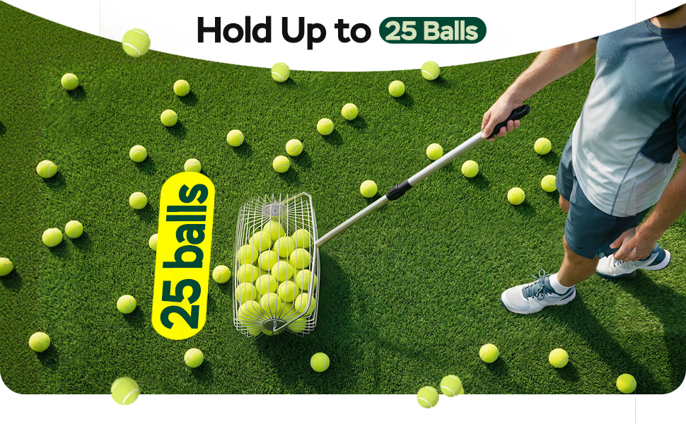 سهولة الالتقاط: إن أداة تجميع الكرات المتدحرجة سهلة الاستخدام دون الحاجة إلى الضغط لأسفل - ادفعها أثناء المشي لالتقاط كرات التنس دون عناء. يمكن لحاوية الكرات الكبيرة استيعاب ما يصل إلى 25 كرة تنس