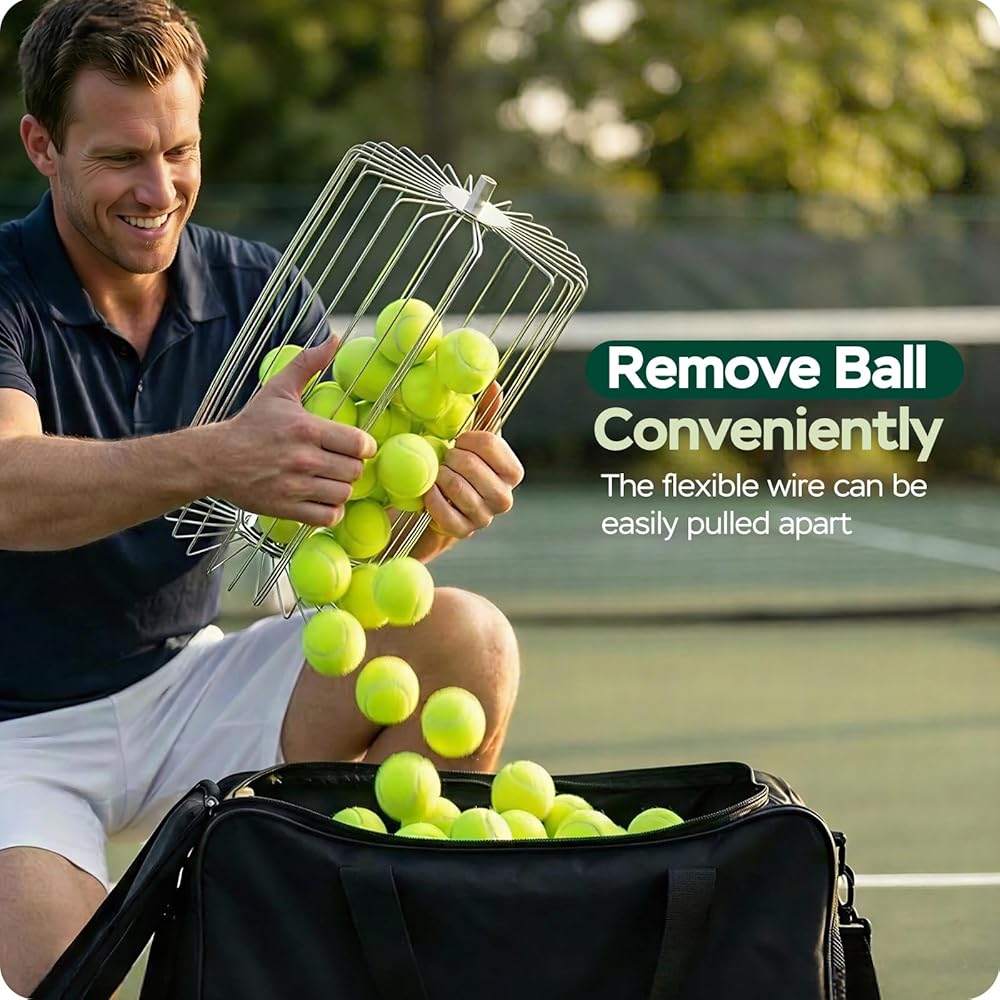 مادة سبيكة متينة: بكرة تجميع كرات التنس مصنوعة من 30 سلكًا معدنيًا قويًا ومرنًا، مقاومة للتآكل، مما يضمن الاستخدام طويل الأمد. من السهل التقاط كرات التنس وإطلاقها