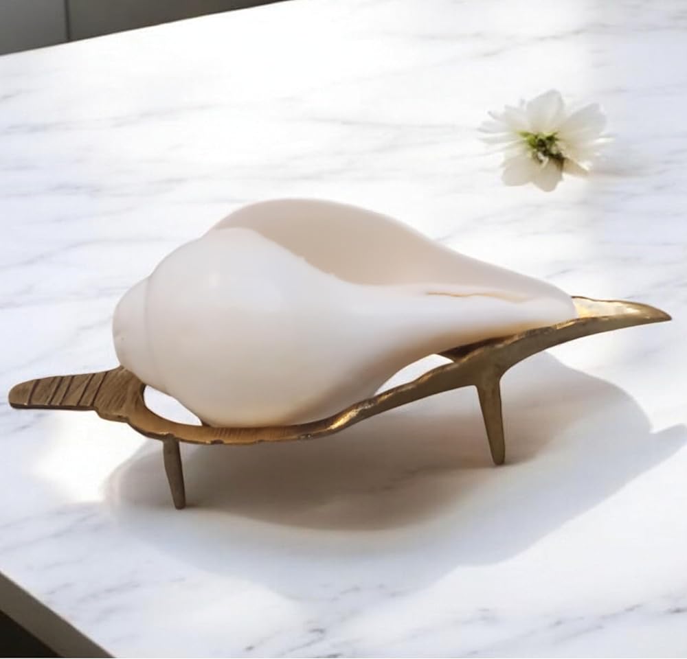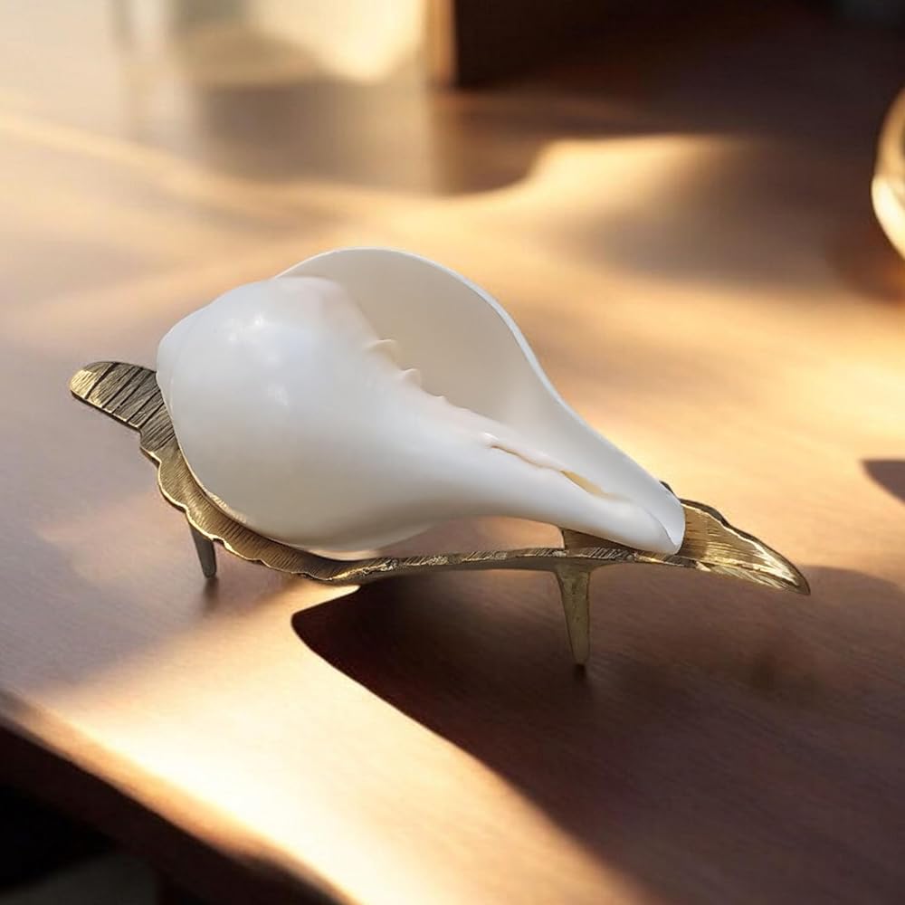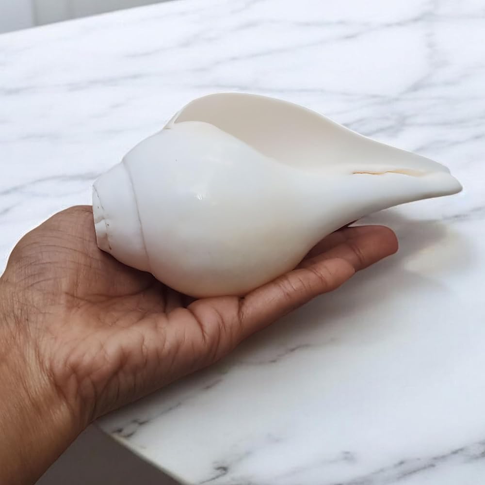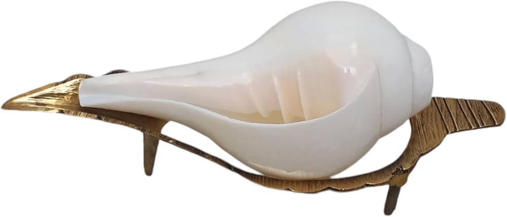 Size: 5"Inch Shankh With 7.5 Inch Stand Weight: 300 Gram. Vamavarti Shankh, also known as a left-handed conch shell, holds spiritual significance in Hinduism. It is believed to have several benefits when used in religious practices and rituals. Here are some of the benefits associated with the Vamavarti Shankh: Spiritual Significance: The Vamavarti Shankh is considered sacred and auspicious in Hindu culture. It is believed to be associated with Lord Vishnu and the divine feminine energy. Positive Vibrations: Blowing the Vamavarti Shankh is believed to create positive vibrations and purify the environment. It is often used in religious ceremonies, rituals, and prayers to enhance the spiritual atmosphere. Warding off Negative Energies: The sound produced by blowing the Vamavarti Shankh is said to dispel negative energies, ward off evil spirits, and cleanse the surroundings. It is believed to create a protective aura. Spiritual Awakening: Using the Vamavarti Shankh in meditation or chanting practices is believed to facilitate spiritual awakening. The sound vibrations are said to help in deepening concentration, promoting inner peace, and experiencing a state of transcendence. Symbol of Prosperity: The Vamavarti Shankh is considered a symbol of wealth and abundance. It is believed to attract prosperity and good fortune when kept in homes or workplaces. Healing Properties: It is believed that drinking water from the Vamavarti Shankh can have purifying and healing effects on the body and mind. The water is said to acquire the divine vibrations of the conch shell. Cultural and Religious Significance: The Vamavarti Shankh holds great cultural and religious significance in Hindu rituals and ceremonies. It is often used in festivals, marriages, and other auspicious occasions to invoke blessings and mark the presence of divinity.