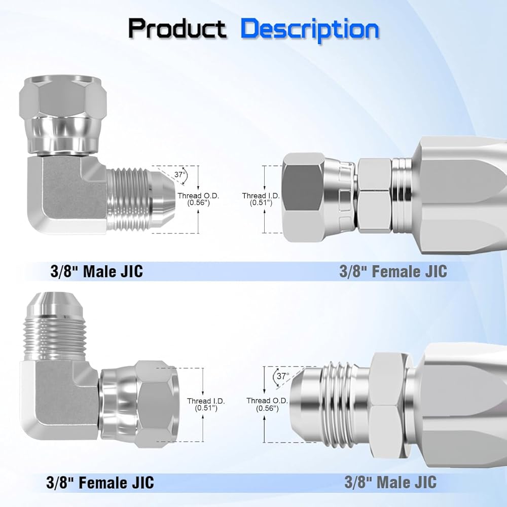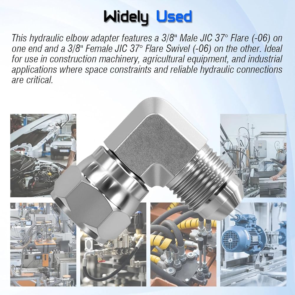【Superb Compatibility】This hydraulic elbow adapter features a 3/8" Male JIC 37° Flare (-06) on one end and a 3/8" Female JIC 37° Flare Swivel (-06) on the other. Manufactured to SAE J514 standards for guaranteed fit and performance in high-pressure hydraulic systems.