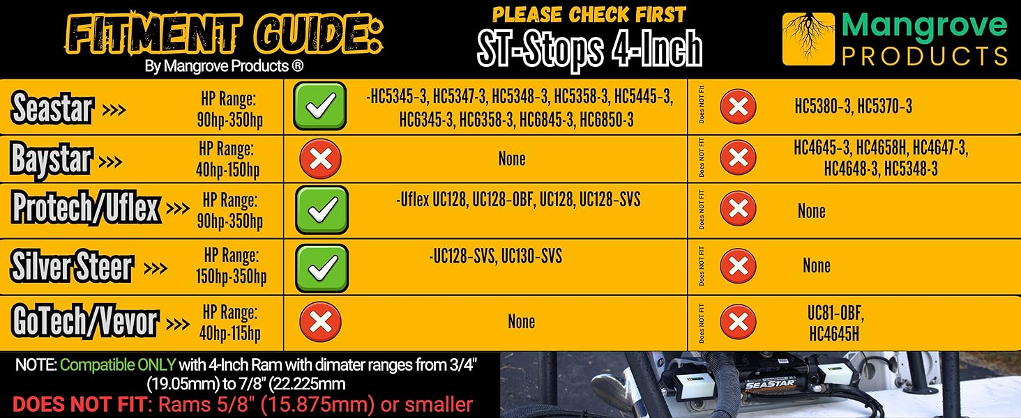 • ✅SPECIFIC FITMENT: Our outboard steering locks fill fit 3/4 in. (19.05 mm), 25/32 in. (20 mm), and 7/8 in. (22.225 mm, NOTE: this size will fit very snug) hydraulic steering systems that utilize 4 inch rams. Compatible with Hydraulic Steering Brands include SeaStar, Protech, Silver Steer, and Uflex. NOT Compatible with Baystar, GoTech, and Vevor systems. Ensure each piston length is 4 in. when the outboard is centered for best fitment. Singular arm hydraulic systems are NOT compatible.