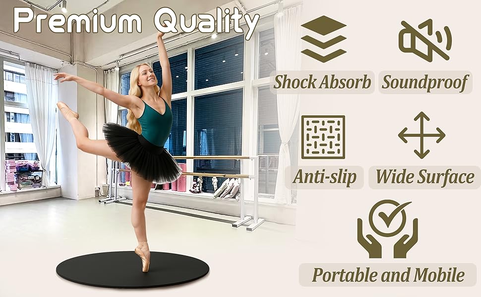 【سطح خشبي صلب أملس وسريع الاستجابة】تتميز أرضية الرقص هذه بنواة من الخشب الصلب الفاخر مع طبقة علوية مقاومة للماء، والتي توفر احتكاكًا ممتازًا ودورانًا سلسًا وكمية مناسبة من الثبات - مثالية للصنبور والباليه والجاز والمعاصرة والهيب هوب والمزيد. يمنحك قطرها الكبير مساحة واسعة للحركة الديناميكية.