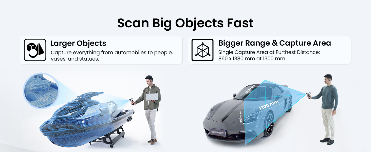 المسح الموسع: مسح سريع ثلاثي الأبعاد للسيارات والآلات الكبيرة أو المكونات والأثاث والأشخاص الذين يتمتعون بمساحة التقاط فردية أكبر بنسبة 60% في RANGE 2 تبلغ 860 × 1380 مم عند 1300 مم ومسافة مسح من 400 مم إلى 1300 مم.