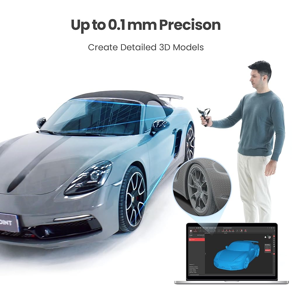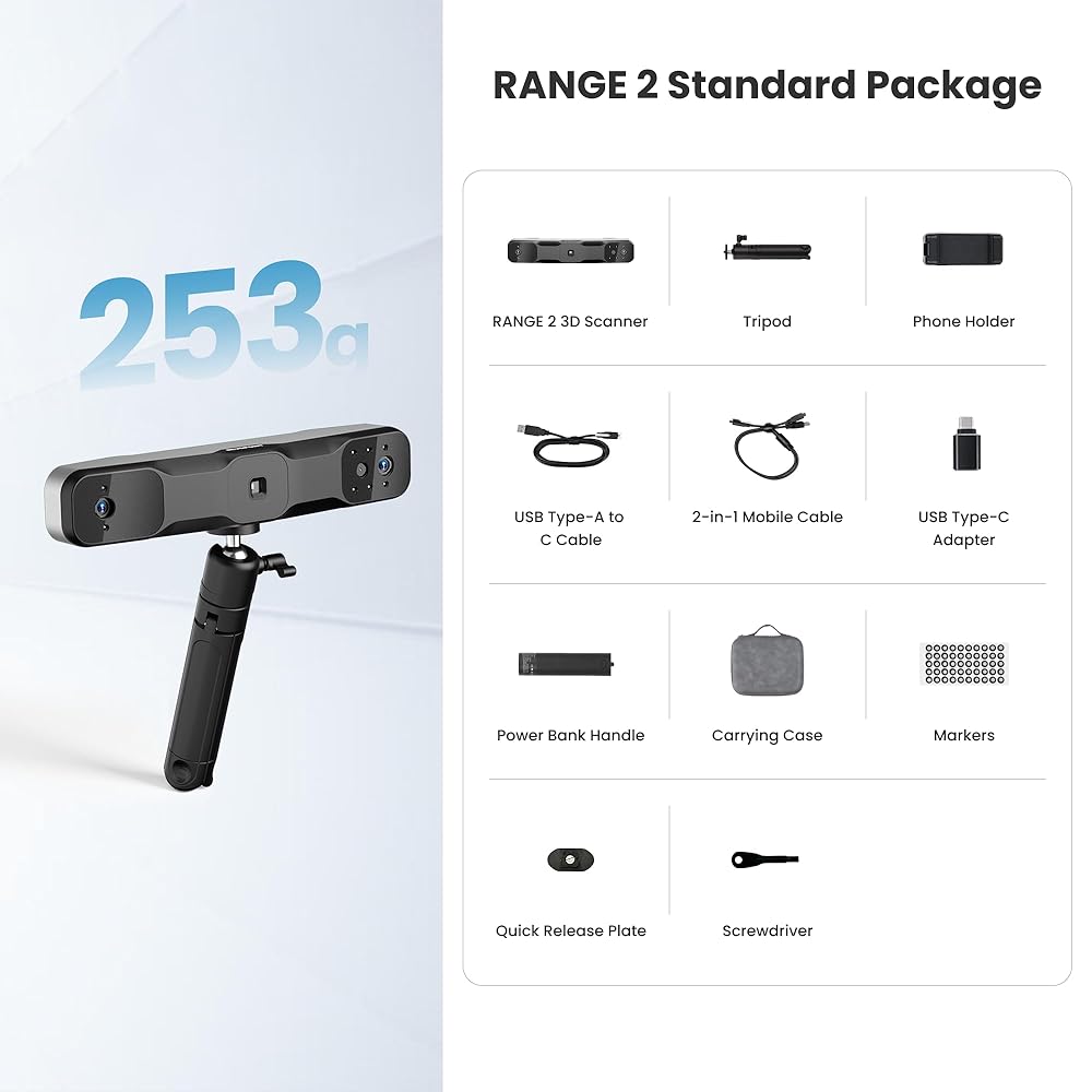 توافق واسع: قم بتوصيل RANGE 2 الخاص بك بأجهزة Windows وmacOS وAndroid وiOS - نماذج الإخراج بتنسيقات PLY وOBJ وSTL وASC و3MF وGLTF وFBX للتوافق مع برامج النمذجة ثلاثية الأبعاد والطابعات ثلاثية الأبعاد