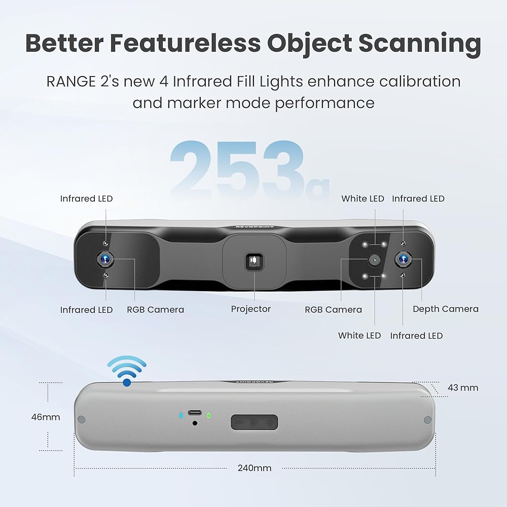 التقاط ألوان مثير للإعجاب: أنشئ نماذج ثلاثية الأبعاد ذات ألوان دقيقة باستخدام كاميرا RGB التي تمت ترقيتها من RANGE 2 ونظام إضاءة Flash LED الجديد، مما يضمن إضاءة الكائنات بشكل متساوٍ لالتقاط ألوان متوازنة.