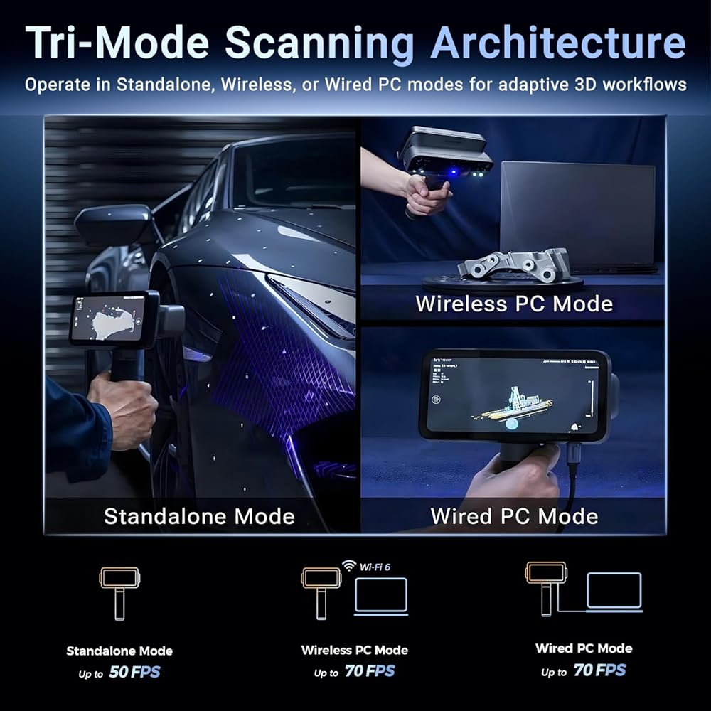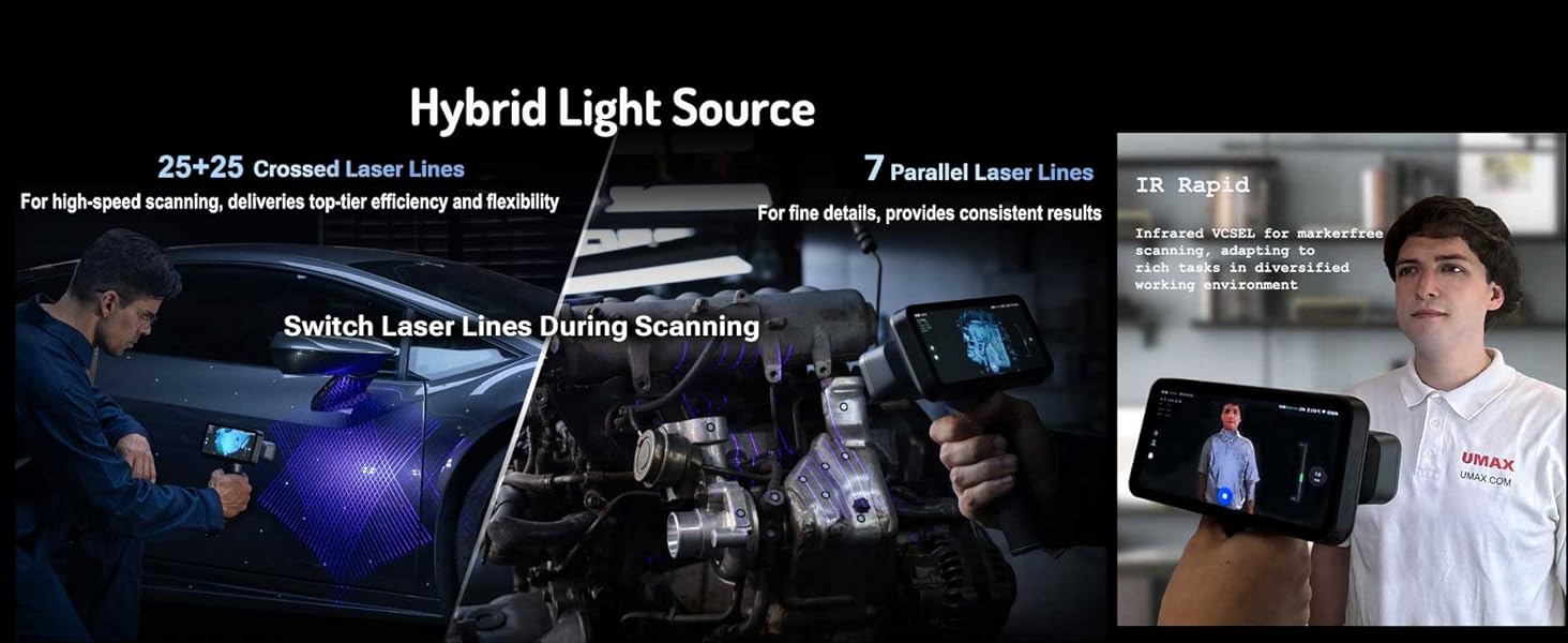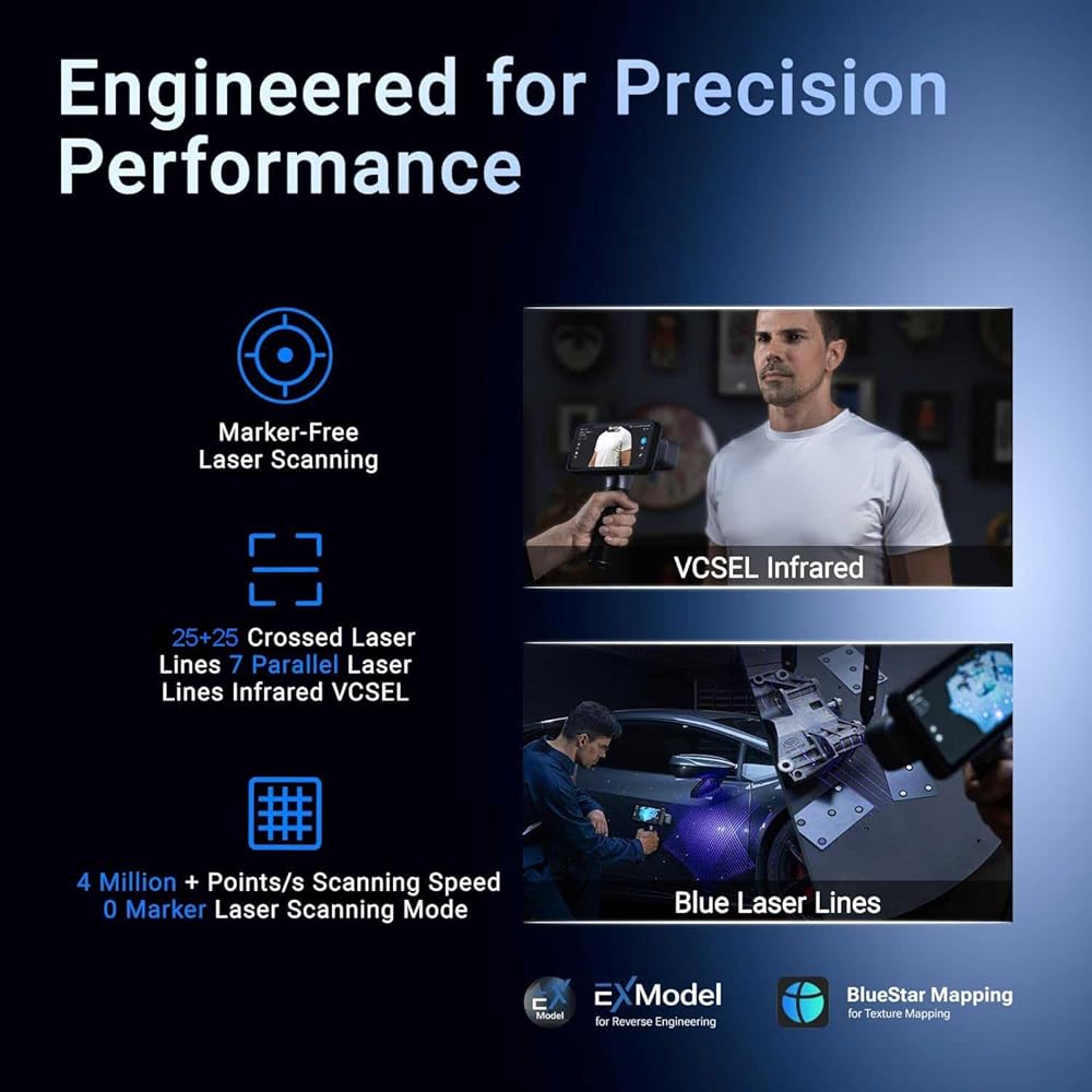 تقنية مصدر الضوء الهجين المتقدمة: حقق الدقة باستخدام تقنية الليزر الأزرق الهجين + IR VCSEL و50 خط ليزر (25+25 متقاطعًا، 7 متوازيًا)، مما يوفر دقة فائقة تبلغ 0.04 مم. يلتقط هذا النظام، جنبًا إلى جنب مع كاميرا بدقة 5 ميجابكسل، أنسجة نابضة بالحياة بدقة عالية، مما يجعله مثاليًا للاستخدام في تطبيقات التصميم والسيارات والهندسة.