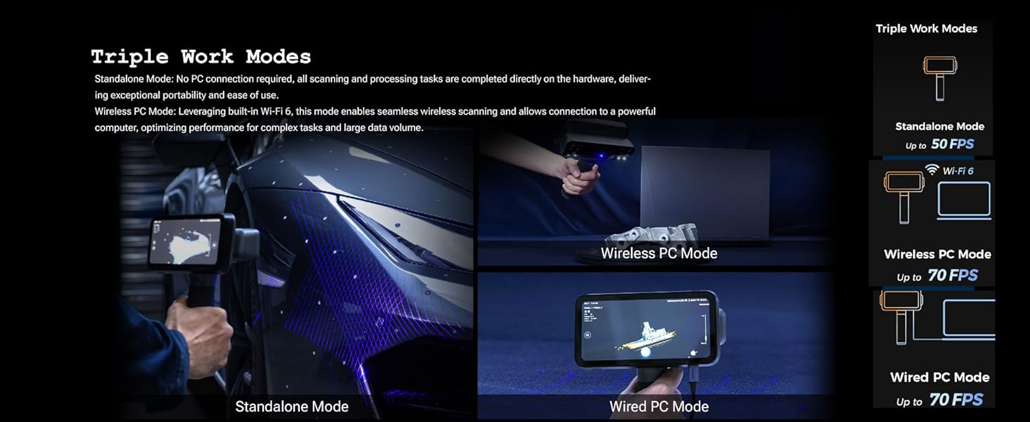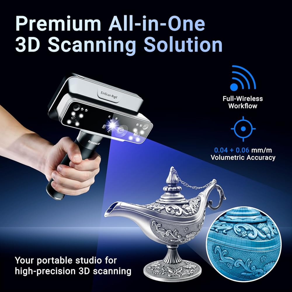 حل المسح اللاسلكي الكل في واحد: استمتع بالمسح الضوئي ثلاثي الأبعاد بسلاسة مع الأوضاع الثلاثية المستقلة والكمبيوتر اللاسلكي والكمبيوتر السلكي. يتميز EinScan Rigil بشبكة Wi-Fi 6 والحوسبة المدمجة، مما يسمح لك بالمسح الضوئي بدون علامات. قم بالمسح الضوئي في أي مكان دون المساس بالدقة أو السرعة أو الأداء. يتضمن تدريبًا شخصيًا فرديًا عبر الإنترنت مع كل عملية شراء للمنتج.