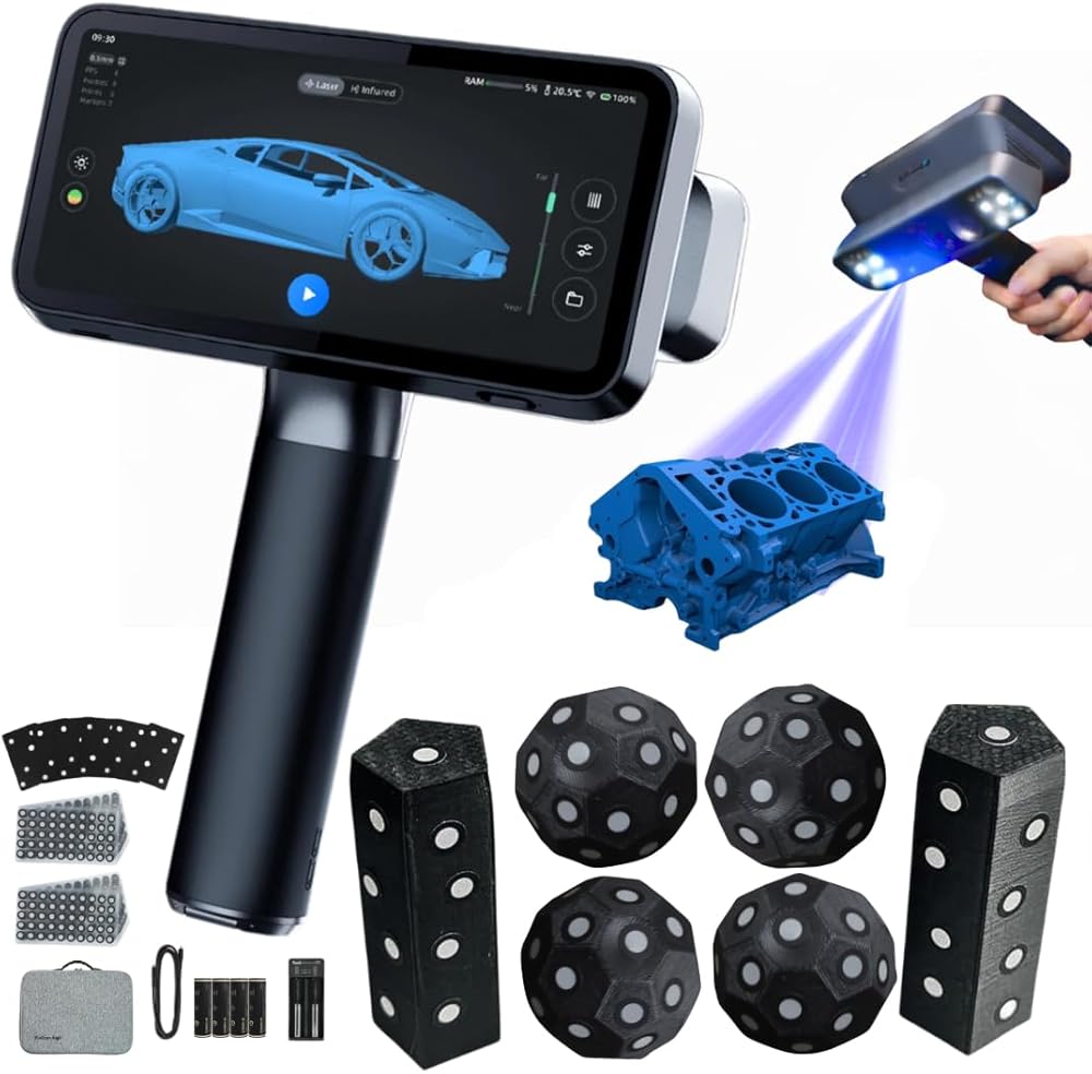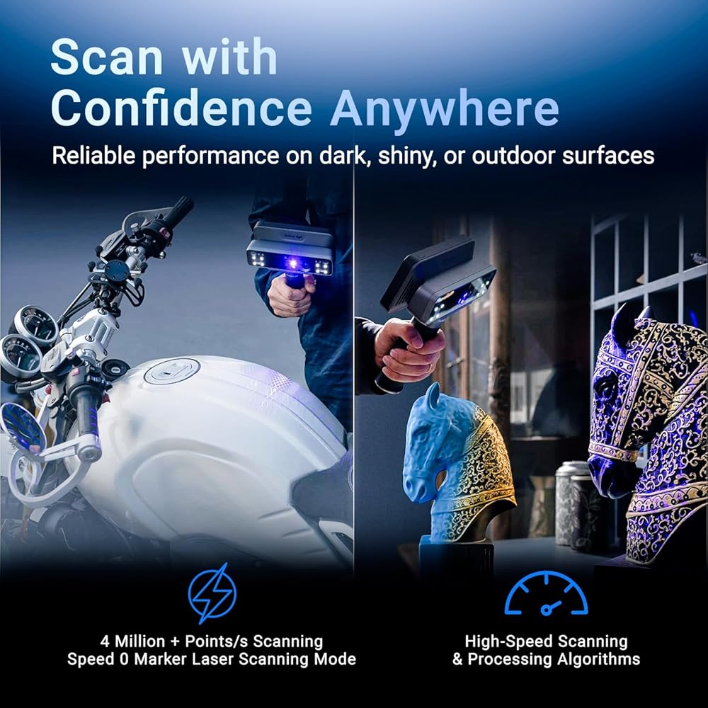 مسح الأسطح الداكنة والعاكسة بسهولة: توفر خوارزمية المسح المتقدمة من Rigil وليزر الأشعة تحت الحمراء القوي عمليات مسح سلسة وخالية من العلامات للأسطح المعدنية الداكنة أو اللامعة دون الحاجة إلى الرش. مثالي لقطع غيار السيارات والمنحوتات والنماذج الأولية، فهو يضمن الدقة العالية والمعالجة السريعة، حتى في ظروف الإضاءة الصعبة.