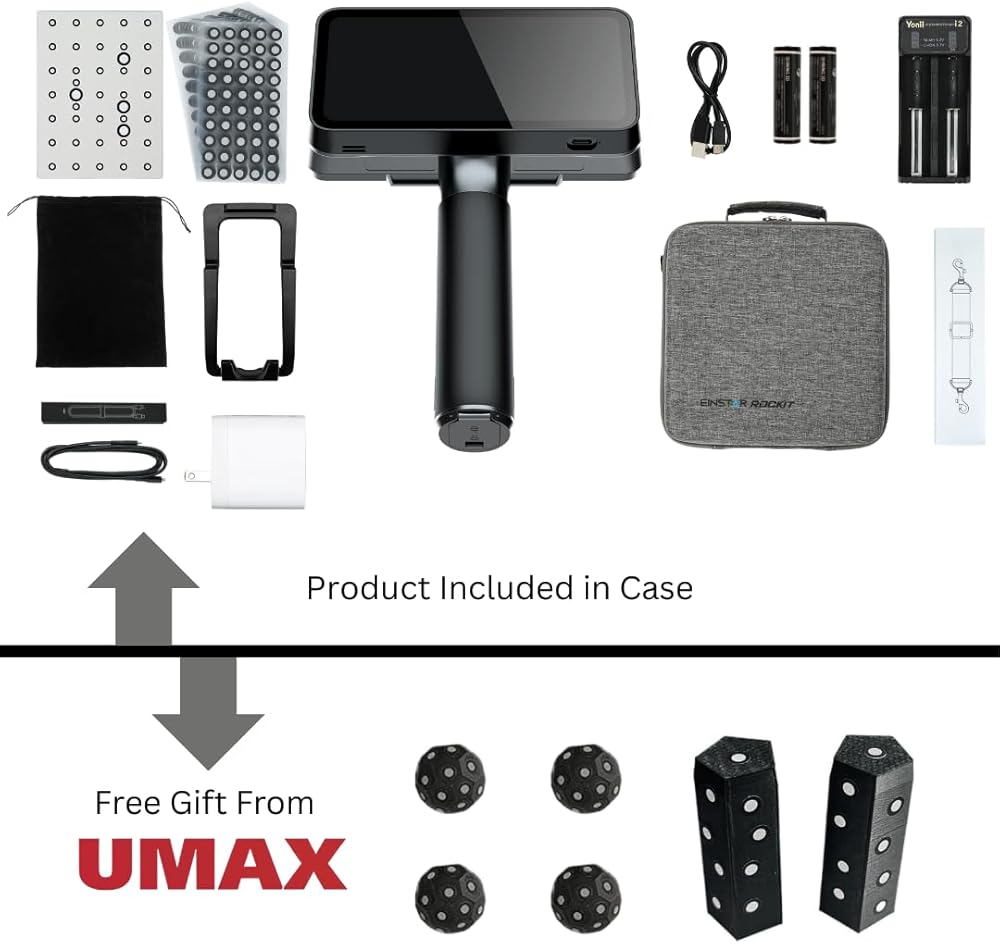حزمة كاملة لسهولة الاستخدام: تتضمن الحزمة EinScan Rigil، والبطارية، وحجرة البطارية وكابل الشحن، وحقيبة الحمل، ولوحة المعايرة، وحامل عالمي، ومحول الطاقة، وكابل من النوع C إلى النوع C، وأداة إزالة العلامات، وعلامات عاكسة 3 مم و6 مم، وقماش تنظيف، وحزمة تعقب أساسية حصرية وقائمة تعبئة.